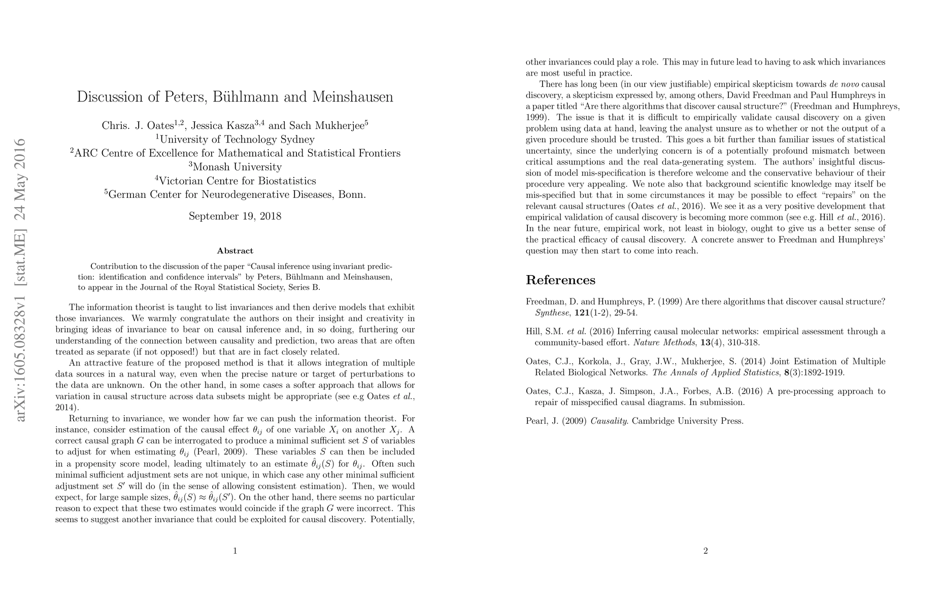 This discussion paper evaluates the methodology proposed by Peters, Bühlmann, and Meinshausen for causal inference using invariant prediction, focusing on identification and confidence interval construction, while highlighting potential improvements and broader implications for statistical practice.