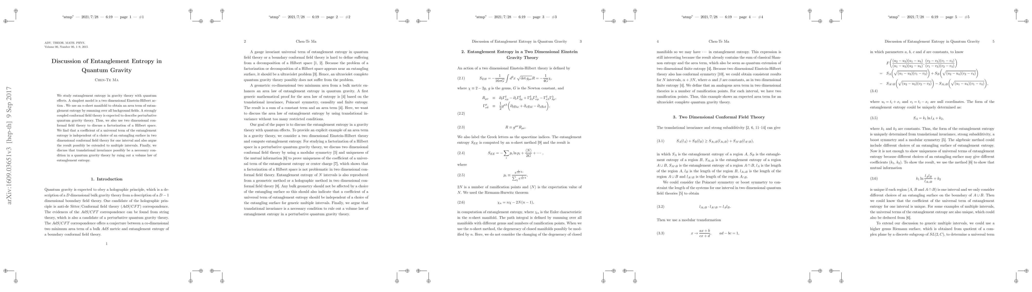 This paper investigates entanglement entropy in quantum gravity using a two-dimensional Einstein-Hilbert action and an $n$-sheet manifold, finding a universal term coefficient independent of entangling surface choice. It argues that translational invariance may be necessary in quantum gravity, disproving a volume law of entanglement entropy.