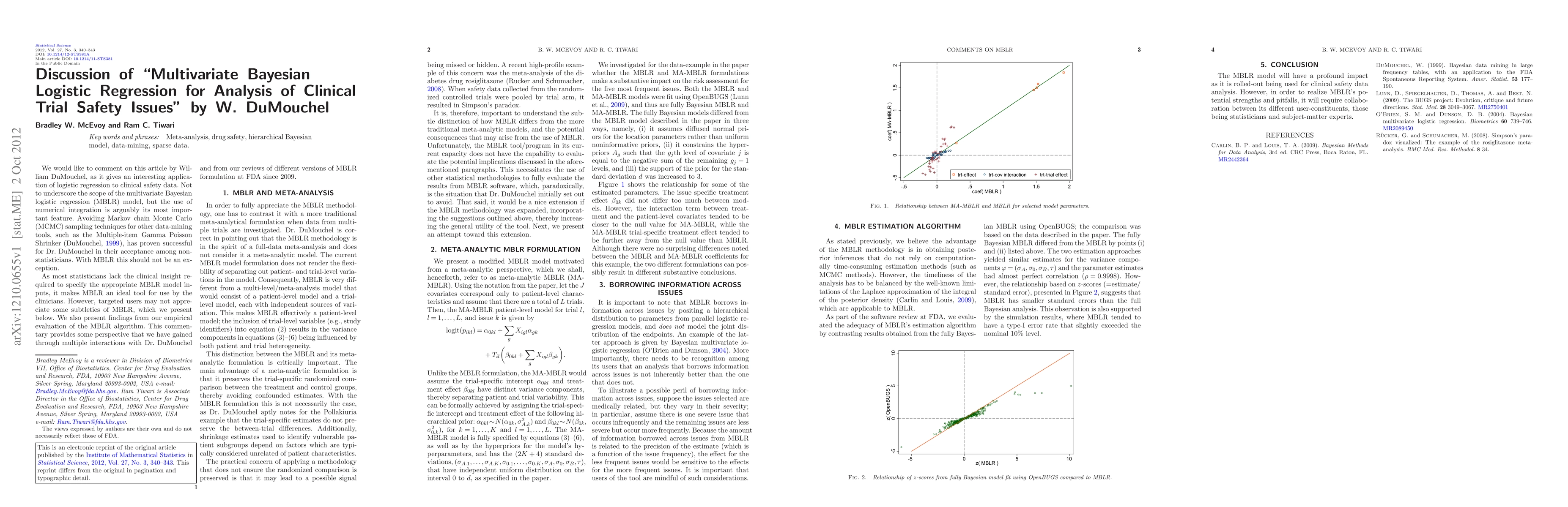 Discussion of "Multivariate Bayesian Logistic Regression for Analysis of Clinical Trial Safety Issues" by W. DuMouchel [arXiv:1210.0385].