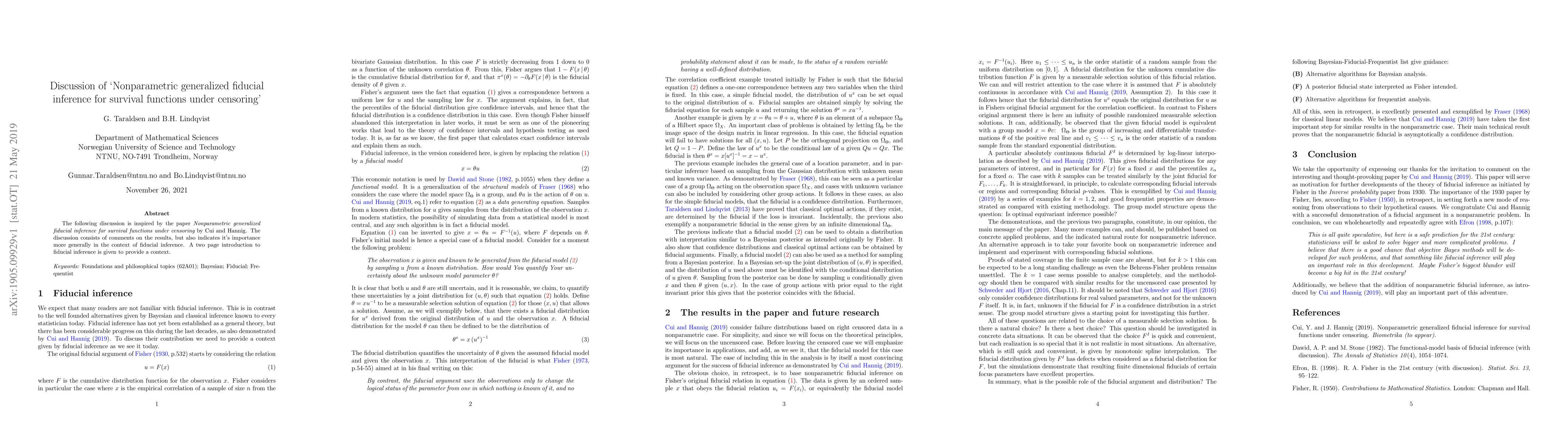 The discussion focuses on the results of the paper Nonparametric generalized fiducial inference for survival functions under censoring by Cui and Hannig.
