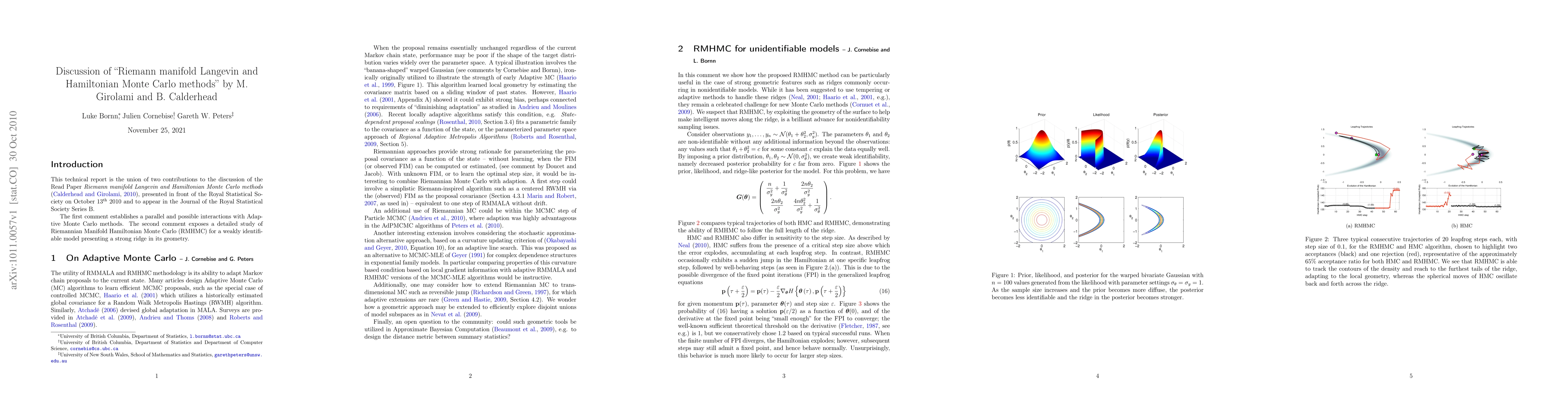 This technical report is the union of two contributions to the discussion of the Read Paper "Riemann manifold Langevin and Hamiltonian Monte Carlo methods" by B. Calderhead and M. Girolami, presented in front of the Royal Statistical Society on October 13th 2010 and to appear in the Journal of the Royal Statistical Society Series B. The first comment establishes a parallel and possible interactions with Adaptive Monte Carlo methods. The second comment exposes a detailed study of Riemannian Manifold Hamiltonian Monte Carlo (RMHMC) for a weakly identifiable model presenting a strong ridge in its geometry.