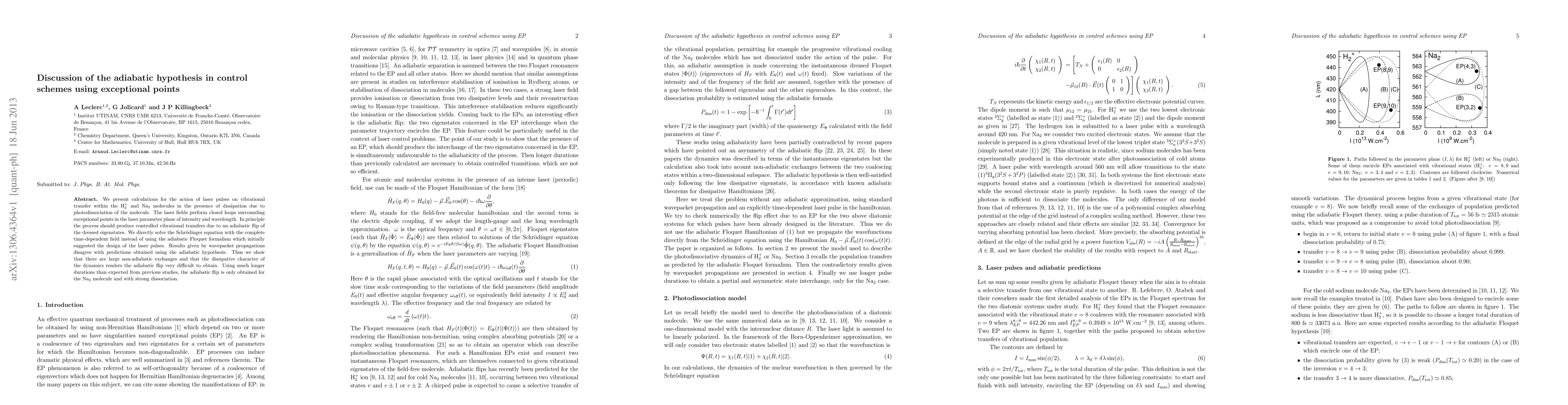 We present calculations for the action of laser pulses on vibrational transfer within the H2+ and Na2 molecules in the presence of dissipation due to photodissociation of the molecule. The laser fields perform closed loops surrounding exceptional points in the laser parameter plane of intensity and wavelength. In principle the process should produce controlled vibrational transfers due to an adiabatic flip of the dressed eigenstates. We directly solve the Schr\"odinger equation with the complete time-dependent field instead of using the adiabatic Floquet formalism which initially suggested the design of the laser pulses. Results given by wavepacket propagations disagree with predictions obtained using the adiabatic hypothesis. Thus we show that there are large non-adiabatic exchanges and that the dissipative character of the dynamics renders the adiabatic flip very difficult to obtain. Using much longer durations than expected from previous studies, the adiabatic flip is only obtained for the Na2 molecule and with strong dissociation.