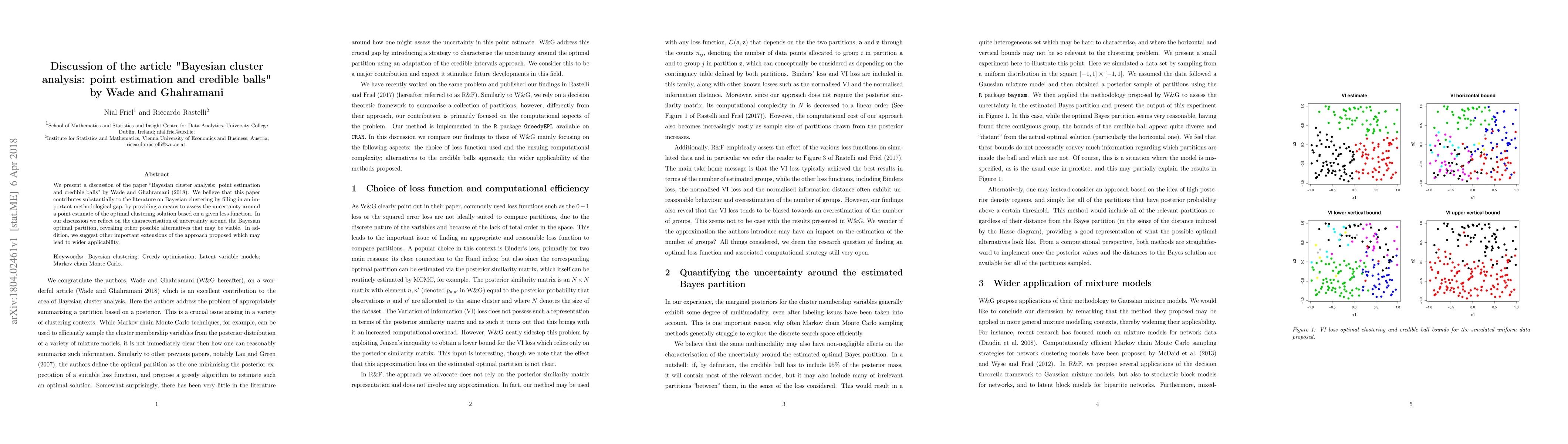 Wade and Ghahramani's paper introduces Bayesian cluster analysis with a focus on point estimation and credible balls, addressing uncertainty in optimal clustering solutions. The discussion highlights alternative methods and suggests extensions for broader applicability.
