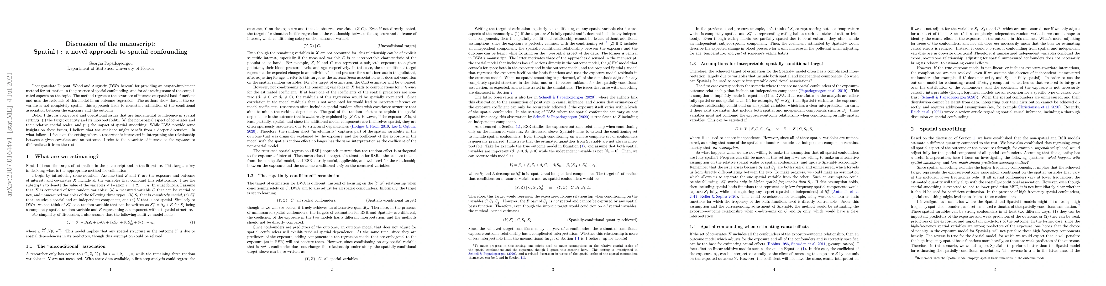 I congratulate Dupont, Wood and Augustin (DWA hereon) for providing an easy-to-implement method for estimation in the presence of spatial confounding, and for addressing some of the complicated aspects on the topic. The method regresses the covariate of interest on spatial basis functions and uses the residuals of this model in an outcome regression. The authors show that, if the covariate is not completely spatial, this approach leads to consistent estimation of the conditional association between the exposure and the outcome. Below I discuss conceptual and operational issues that are fundamental to inference in spatial settings: (i) the target quantity and its interpretability, (ii) the non-spatial aspect of covariates and their relative spatial scales, and (iii) the impact of spatial smoothing. While DWA provide some insights on these issues, I believe that the audience might benefit from a deeper discussion. In what follows, I focus on the setting where a researcher is interested in interpreting the relationship between a given covariate and an outcome. I refer to the covariate of interest as the exposure to differentiate it from the rest.