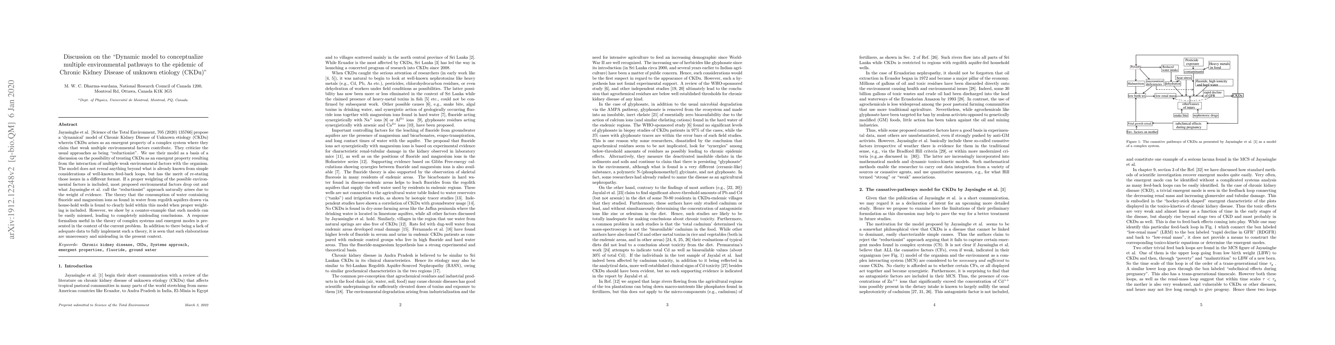 Jayasinghe et al. propose a dynamical model for Chronic Kidney Disease of unknown etiology (CKDu), suggesting it emerges from multiple environmental factors. The authors critique reductionist approaches and argue that proper weighting of environmental factors leads to a "reductionist" conclusion favoring fluoride and magnesium ions in water, though they caution against misuse of such models.