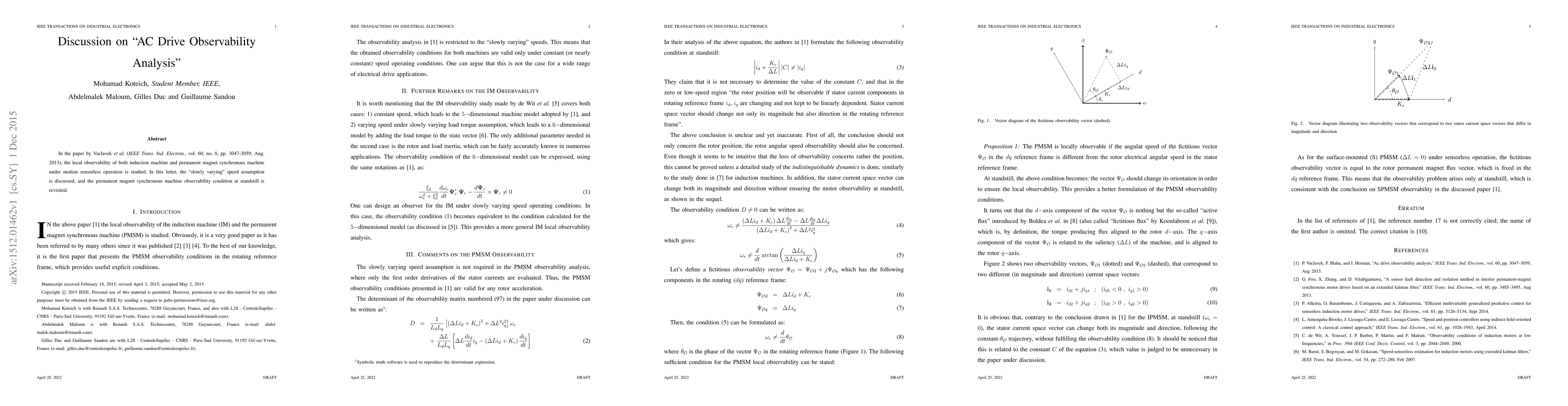 In the paper by Vaclavek et al. (IEEE Trans. Ind. Electron., vol. 60, no. 8, pp. 3047-3059, Aug. 2013), the local observability of both induction machine and permanent-magnet synchronous machine (PMSM) under motion-sensorless operation is studied. In this letter, the "slowly varying" speed assumption is discussed, and the PMSM observability condition at standstill is revisited.