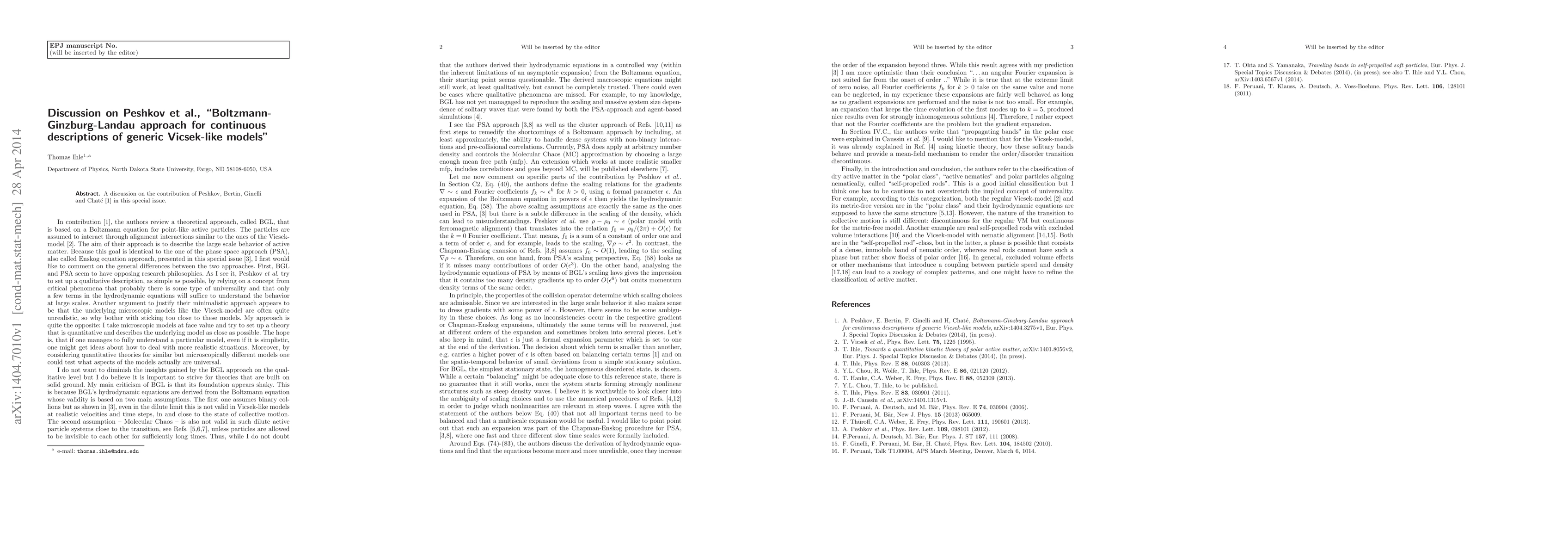 A discussion on the contribution of Peshkov, Bertin, Ginelli and Chate, arxiv:1404.3275v1, in this special issue.