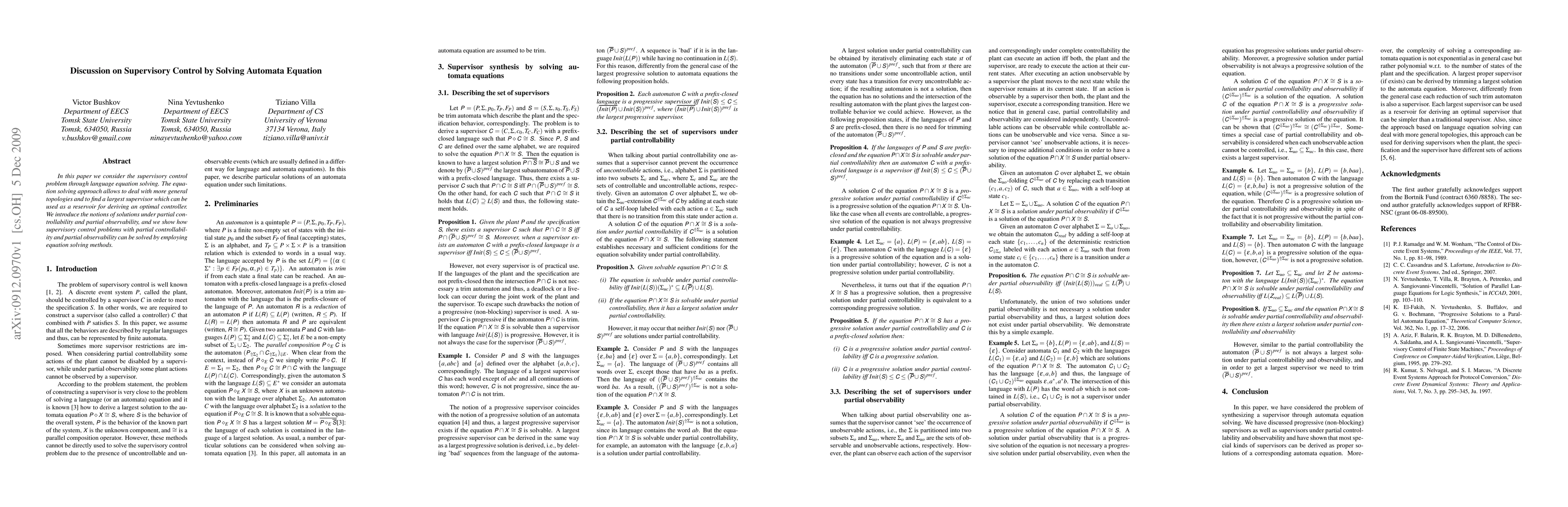 This paper explores supervisory control using language equation solving to address more complex topologies and derive optimal controllers. It introduces solutions under partial controllability and observability, and demonstrates how these methods can solve control problems with limited control and observability.