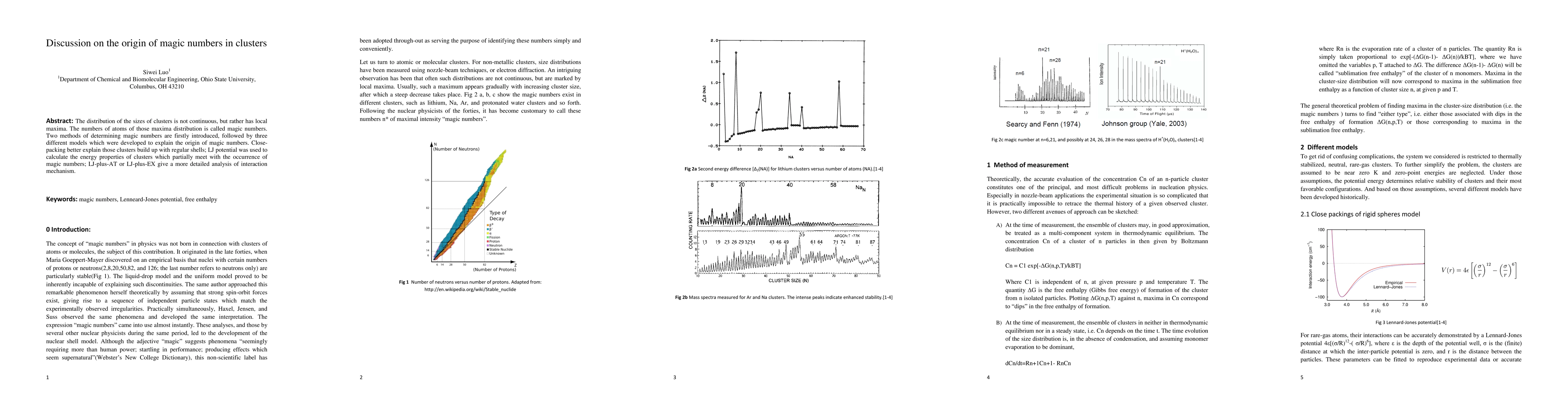 The distribution of the sizes of clusters is not continuous, but rather has local maxima. The numbers of atoms of those maxima distribution is called magic numbers. Two methods of determining magic numbers are firstly introduced, followed by three different models which were developed to explain the origin of magic numbers. Close-packing better explain those clusters build up with regular shells; LJ potential was used to calculate the energy properties of clusters which partially meet with the occurrence of magic numbers; LJ-plus-AT or LJ-plus-EX give a more detailed analysis of interaction mechanism.