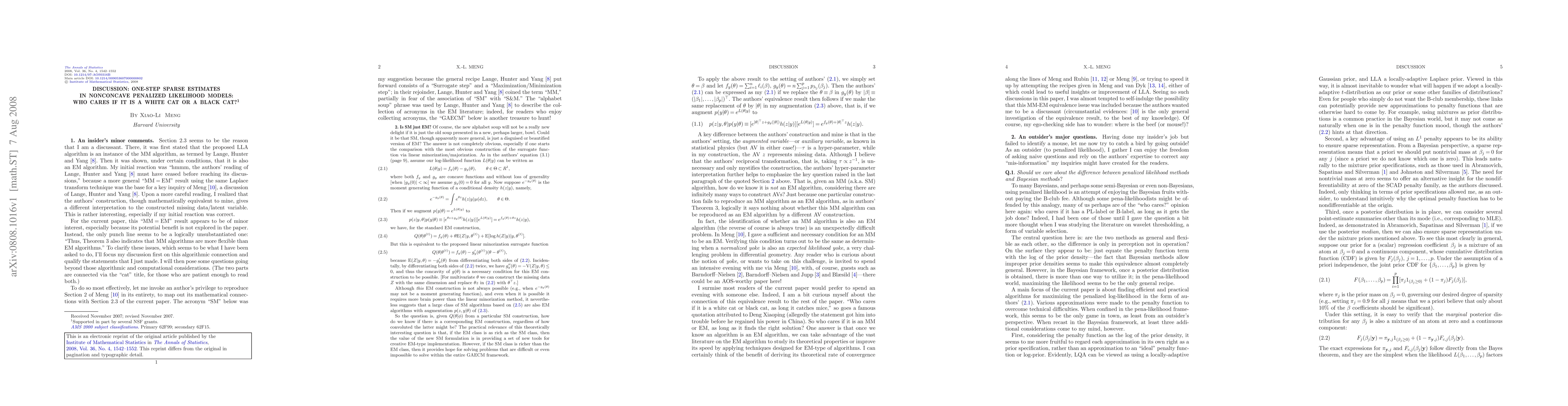 This paper discusses the effectiveness of one-step sparse estimates in nonconcave penalized likelihood models, emphasizing that the method's success is not dependent on the specific nature of the data, akin to the indifference between a white or black cat. The focus is on the robustness and applicability of the proposed estimation technique.