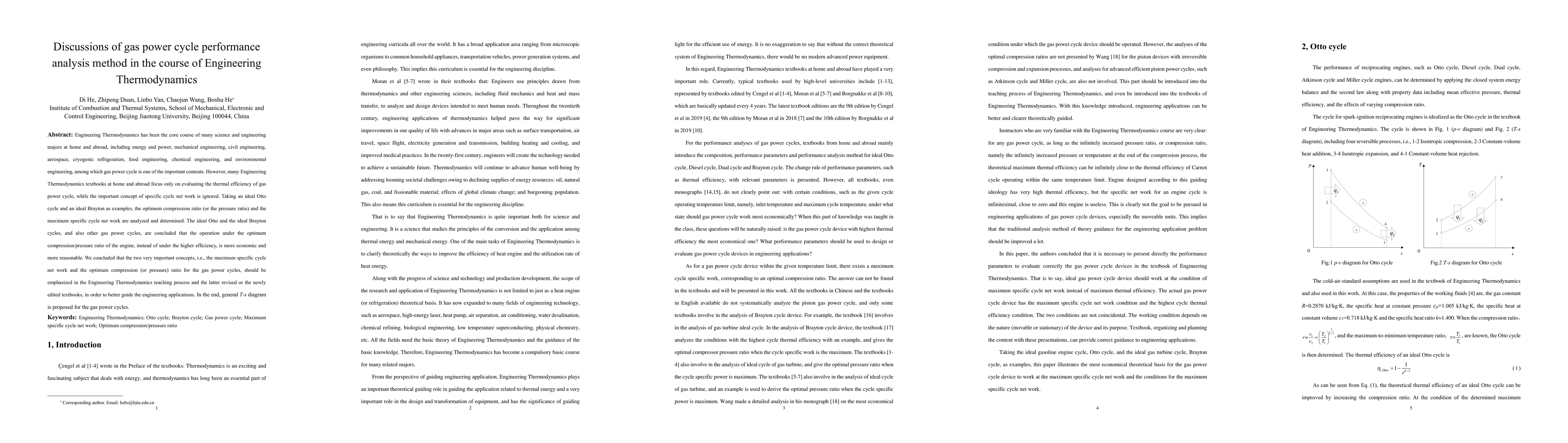The paper argues that Engineering Thermodynamics teaching should emphasize specific cycle net work and optimum compression ratio, rather than just thermal efficiency for gas power cycles. It uses ideal Otto and Brayton cycles to demonstrate that optimal operation for net work, not maximum efficiency, is more economical and reasonable.
