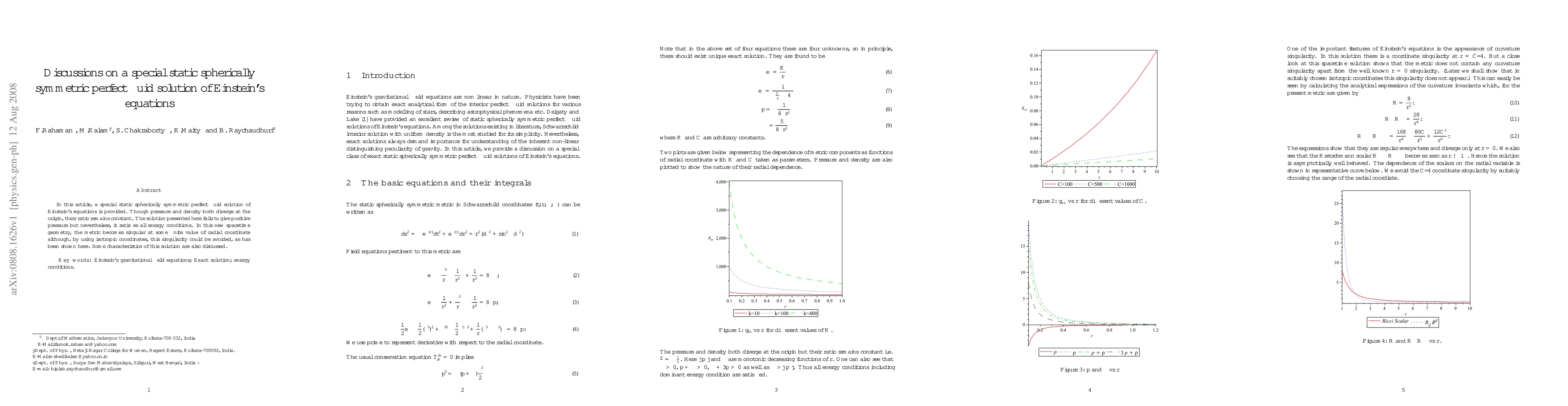 The paper presents a static spherically symmetric perfect fluid solution to Einstein's equations, where pressure and density diverge at the origin but maintain a constant ratio. Although the solution lacks positive pressure, it adheres to all energy conditions and introduces a metric singularity that can be circumvented using isotropic coordinates.