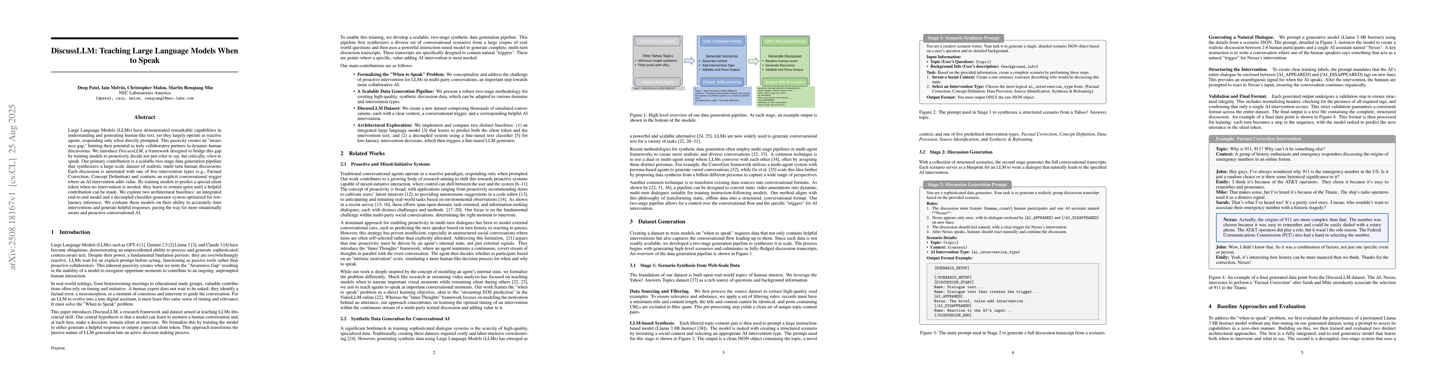 Large Language Models (LLMs) have demonstrated remarkable capabilities in understanding and generating human-like text, yet they largely operate as reactive agents, responding only when directly prompted. This passivity creates an "awareness gap," limiting their potential as truly collaborative partners in dynamic human discussions. We introduce $\textit{DiscussLLM}$, a framework designed to bridge this gap by training models to proactively decide not just $\textit{what}$ to say, but critically, $\textit{when}$ to speak. Our primary contribution is a scalable two-stage data generation pipeline that synthesizes a large-scale dataset of realistic multi-turn human discussions. Each discussion is annotated with one of five intervention types (e.g., Factual Correction, Concept Definition) and contains an explicit conversational trigger where an AI intervention adds value. By training models to predict a special silent token when no intervention is needed, they learn to remain quiet until a helpful contribution can be made. We explore two architectural baselines: an integrated end-to-end model and a decoupled classifier-generator system optimized for low-latency inference. We evaluate these models on their ability to accurately time interventions and generate helpful responses, paving the way for more situationally aware and proactive conversational AI.