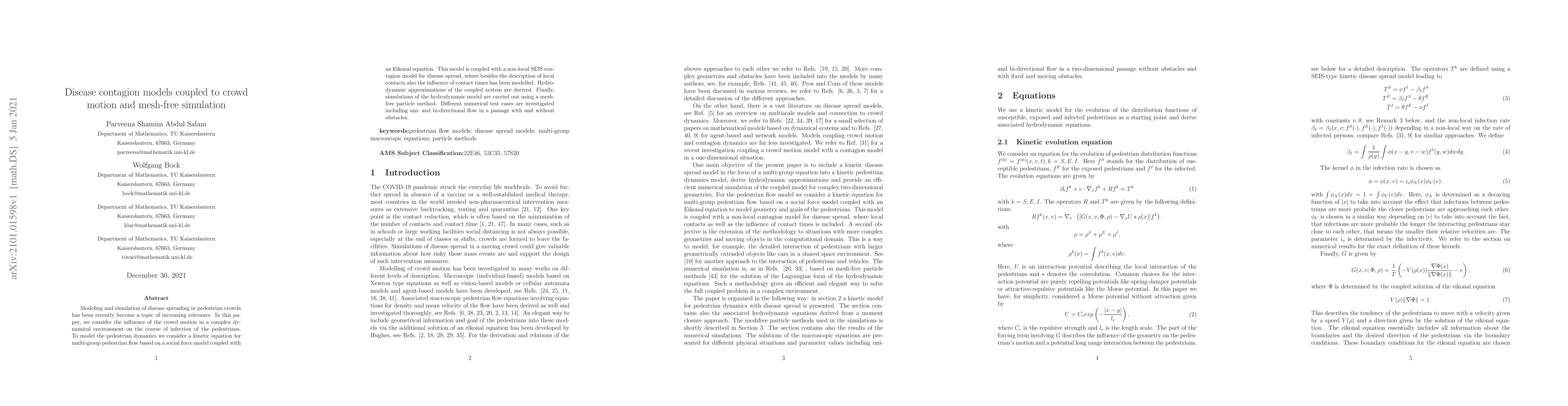 This paper models disease contagion in pedestrian crowds, combining crowd motion dynamics with a non-local SEIS contagion model. It uses a kinetic equation based on a social force model and an Eikonal equation, coupled with hydrodynamic approximations, and simulates the model using a mesh-free particle method.