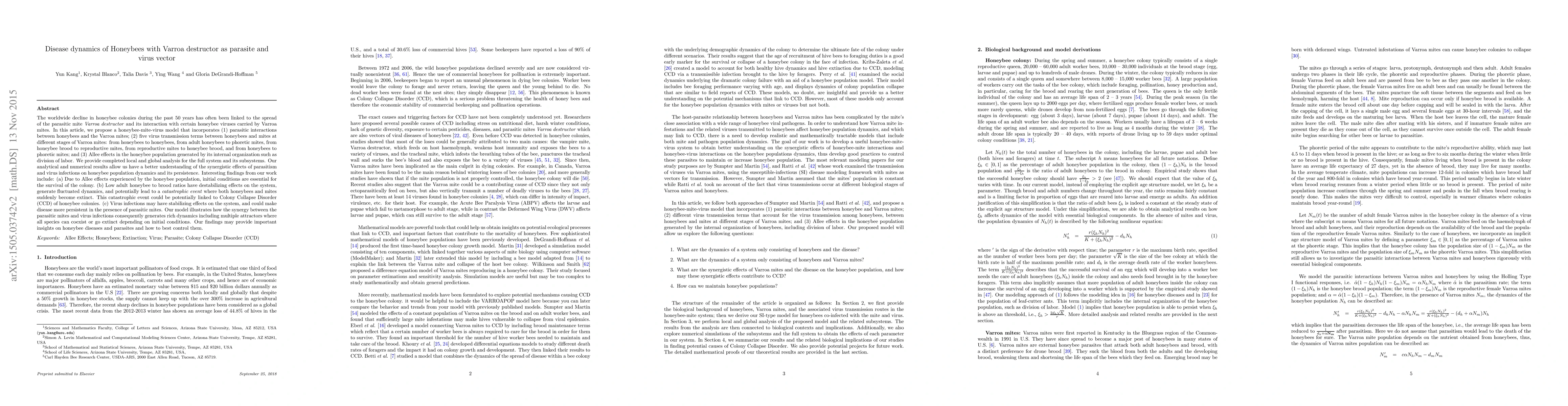 We propose a honeybee-mite-virus model that incorporates (1) parasitic interactions between honeybees and the Varroa mites; (2) five virus transmission terms between honeybees and mites at different stages of Varroa mites: from honeybees to honeybees, from adult honeybees to phoretic mites, from honeybee brood to reproductive mites, from reproductive mites to honeybee brood, and from honeybees to phoretic mites; and (3) Allee effects in the honeybee population generated by its internal organization such as division of labor. We provide completed local and global analysis for the full system and its subsystems. Our analytical and numerical results allow us have a better understanding of the synergistic effects of parasitism and virus infections on honeybee population dynamics and its persistence. Interesting findings from our work include: (a) Due to Allee effects experienced by the honeybee population, initial conditions are essential for the survival of the colony. (b) Low adult honeybee to brood ratios have destabilizing effects on the system, generate fluctuated dynamics, and potentially lead to a \emph{catastrophic event} where both honeybees and mites suddenly become extinct. This catastrophic event could be potentially linked to Colony Collapse Disorder (CCD) of honeybee colonies. (c) Virus infections may have stabilizing effects on the system, and could make disease more persistent in the presence of parasitic mites. Our model illustrates how the synergy between the parasitic mites and virus infections consequently generates rich dynamics including multiple attractors where all species can coexist or go extinct depending on initial conditions. Our findings may provide important insights on honeybee diseases and parasites and how to best control them.