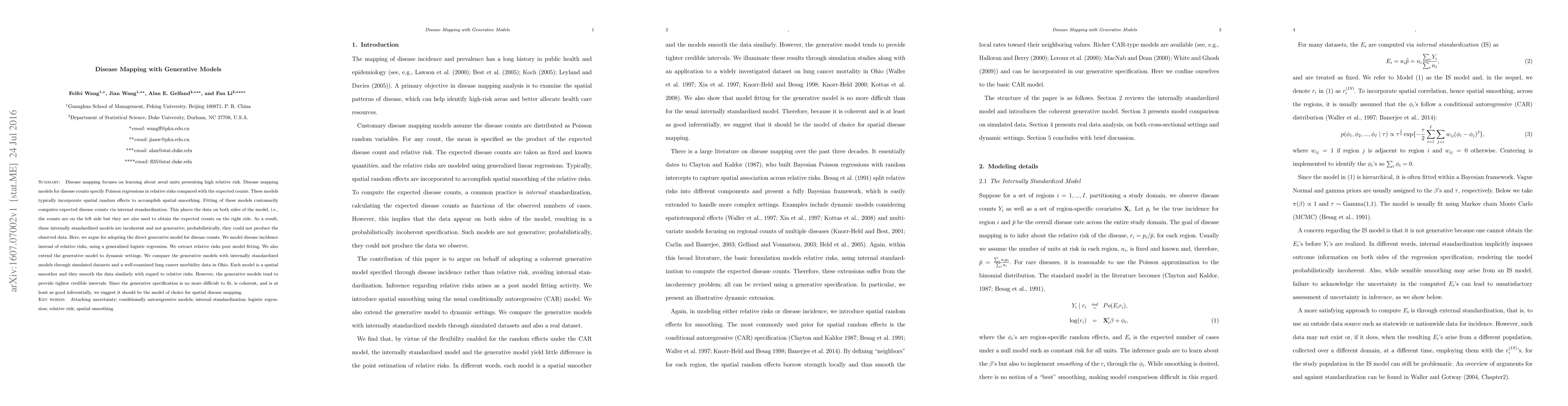 This paper proposes using direct generative models for disease mapping, which model disease incidence with generalized logistic regression and extract relative risks post-fitting, instead of traditional internally standardized models. The generative models provide tighter credible intervals and are coherent, making them preferable for spatial disease mapping.