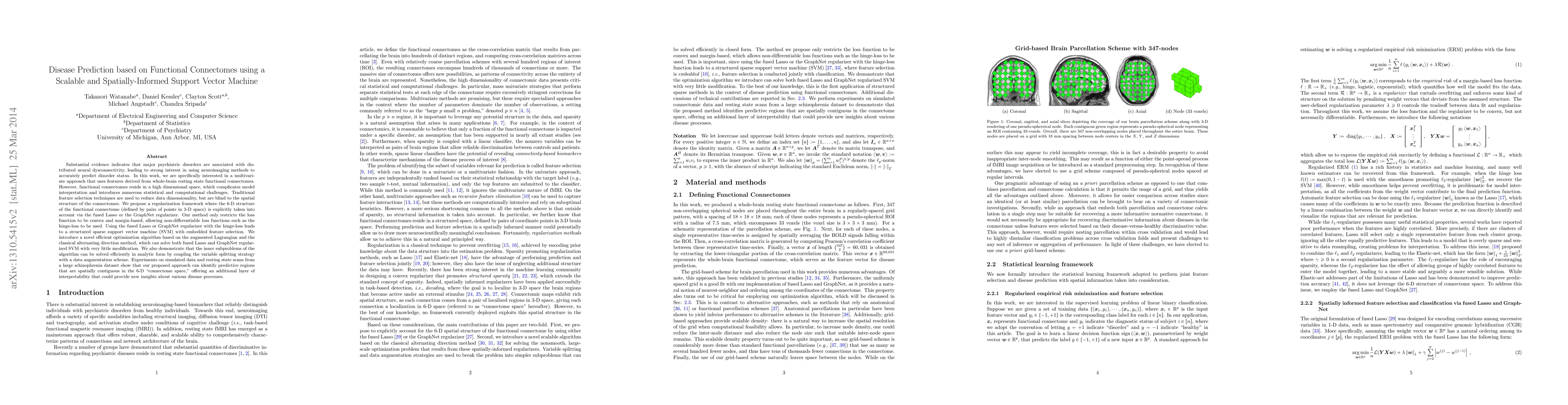 Substantial evidence indicates that major psychiatric disorders are associated with distributed neural dysconnectivity, leading to strong interest in using neuroimaging methods to accurately predict disorder status. In this work, we are specifically interested in a multivariate approach that uses features derived from whole-brain resting state functional connectomes. However, functional connectomes reside in a high dimensional space, which complicates model interpretation and introduces numerous statistical and computational challenges. Traditional feature selection techniques are used to reduce data dimensionality, but are blind to the spatial structure of the connectomes. We propose a regularization framework where the 6-D structure of the functional connectome is explicitly taken into account via the fused Lasso or the GraphNet regularizer. Our method only restricts the loss function to be convex and margin-based, allowing non-differentiable loss functions such as the hinge-loss to be used. Using the fused Lasso or GraphNet regularizer with the hinge-loss leads to a structured sparse support vector machine (SVM) with embedded feature selection. We introduce a novel efficient optimization algorithm based on the augmented Lagrangian and the classical alternating direction method, which can solve both fused Lasso and GraphNet regularized SVM with very little modification. We also demonstrate that the inner subproblems of the algorithm can be solved efficiently in analytic form by coupling the variable splitting strategy with a data augmentation scheme. Experiments on simulated data and resting state scans from a large schizophrenia dataset show that our proposed approach can identify predictive regions that are spatially contiguous in the 6-D "connectome space," offering an additional layer of interpretability that could provide new insights about various disease processes.