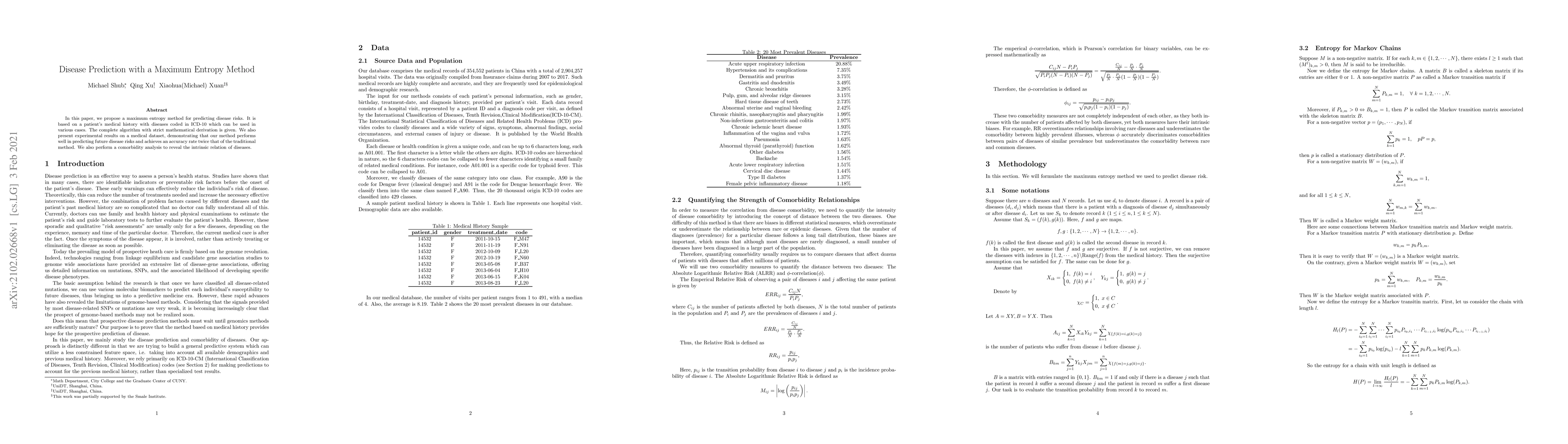 The paper presents a maximum entropy method for disease prediction, providing a complete algorithm with mathematical derivations and experimental validation.