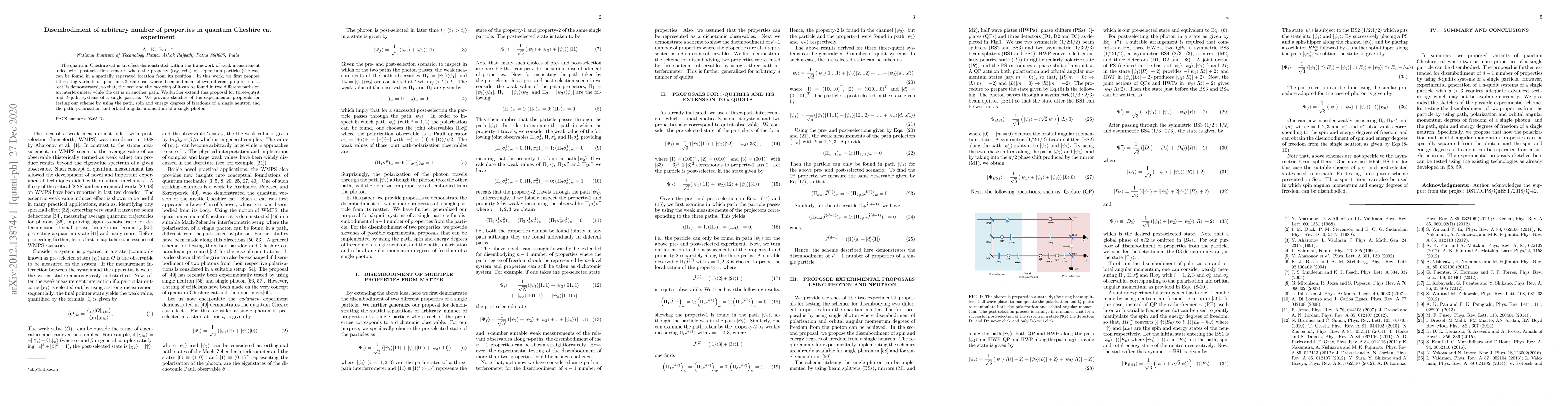 This paper explores quantum Cheshire cat effects where multiple properties of a quantum particle can be spatially separated from the particle itself, demonstrating disembodiment of two properties in an interferometer setup and extending the concept to multi-qudit systems. Experimental proposals for testing these ideas using neutrons and photons are also outlined.