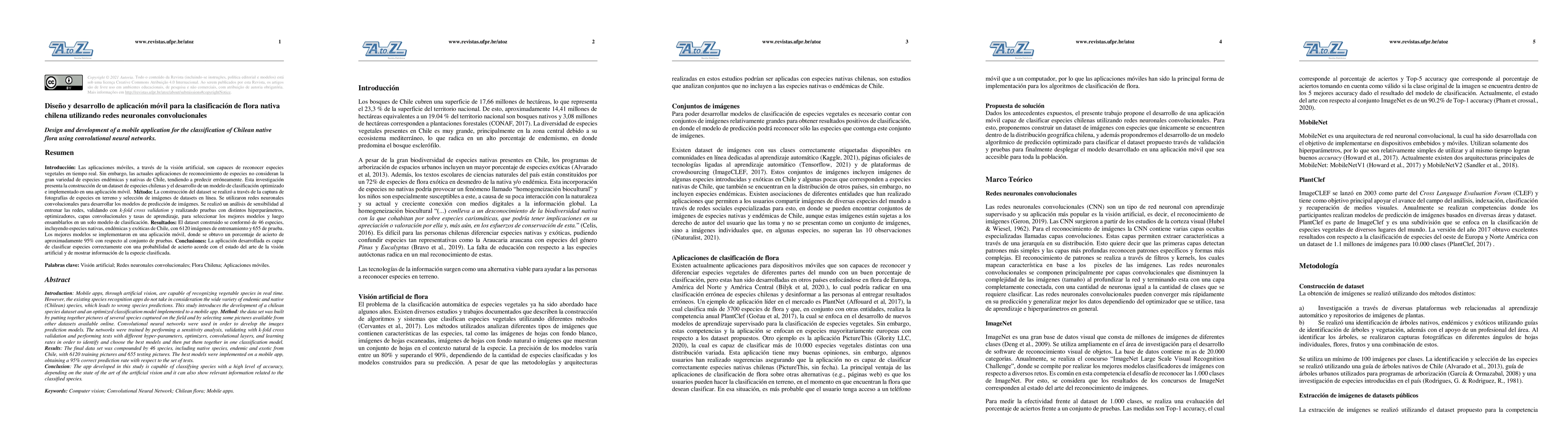 Introduction: Mobile apps, through artificial vision, are capable of recognizing vegetable species in real time. However, the existing species recognition apps do not take in consideration the wide variety of endemic and native (Chilean) species, which leads to wrong species predictions. This study introduces the development of a chilean species dataset and an optimized classification model implemented to a mobile app. Method: the data set was built by putting together pictures of several species captured on the field and by selecting some pictures available from other datasets available online. Convolutional neural networks were used in order to develop the images prediction models. The networks were trained by performing a sensitivity analysis, validating with k-fold cross validation and performing tests with different hyper-parameters, optimizers, convolutional layers, and learning rates in order to identify and choose the best models and then put them together in one classification model. Results: The final data set was compounded by 46 species, including native species, endemic and exotic from Chile, with 6120 training pictures and 655 testing pictures. The best models were implemented on a mobile app, obtaining a 95% correct prediction rate with respect to the set of tests. Conclusion: The app developed in this study is capable of classifying species with a high level of accuracy, depending on the state of the art of the artificial vision and it can also show relevant information related to the classified species.