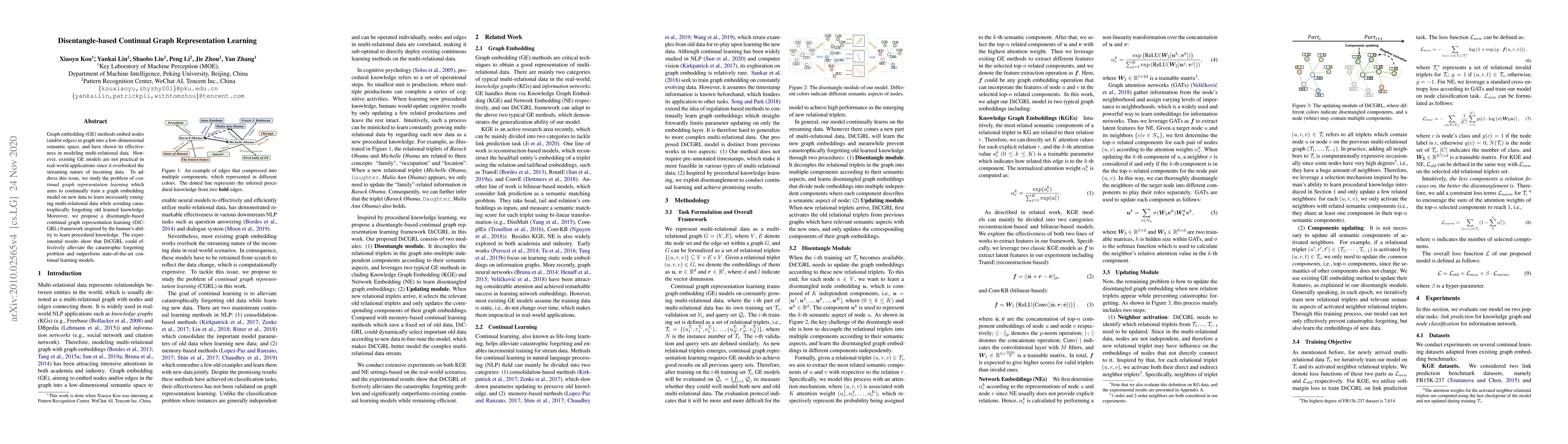 This paper proposes a disentangle-based continual graph representation learning (DiCGRL) framework to address the challenge of training graph embedding models on streaming data without forgetting previously learned knowledge. Experimental results demonstrate that DiCGRL effectively mitigates catastrophic forgetting and outperforms existing continual learning methods.