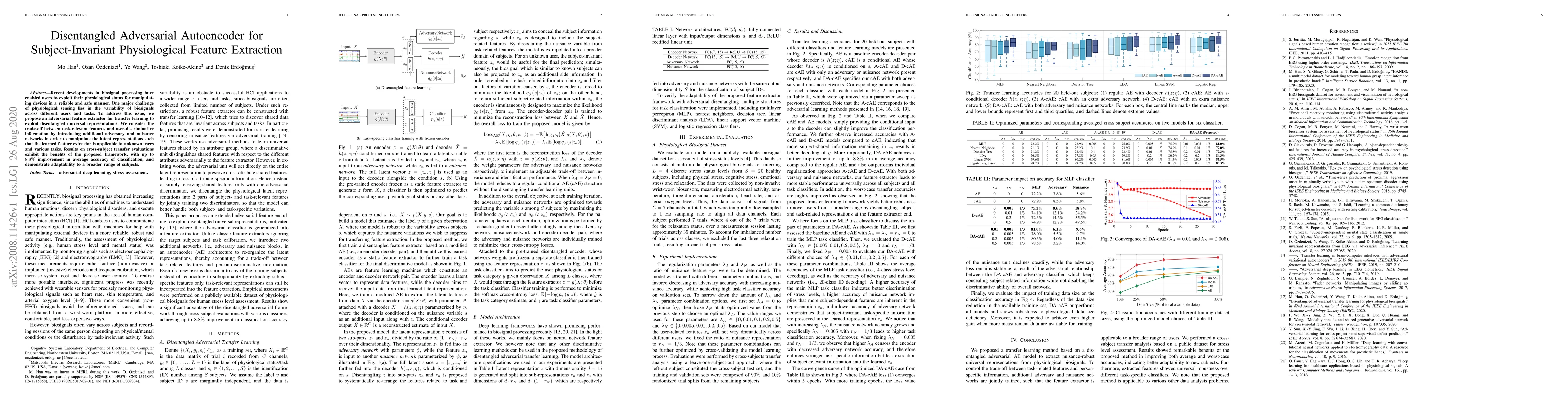 Recent developments in biosignal processing have enabled users to exploit their physiological status for manipulating devices in a reliable and safe manner. One major challenge of physiological sensing lies in the variability of biosignals across different users and tasks. To address this issue, we propose an adversarial feature extractor for transfer learning to exploit disentangled universal representations. We consider the trade-off between task-relevant features and user-discriminative information by introducing additional adversary and nuisance networks in order to manipulate the latent representations such that the learned feature extractor is applicable to unknown users and various tasks. Results on cross-subject transfer evaluations exhibit the benefits of the proposed framework, with up to 8.8% improvement in average accuracy of classification, and demonstrate adaptability to a broader range of subjects.