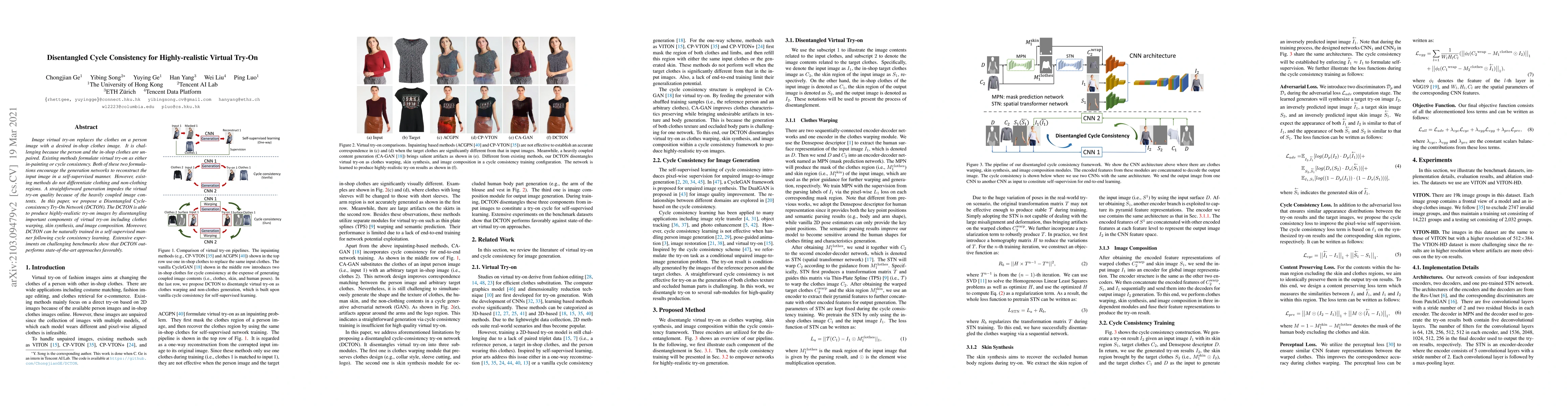 This paper proposes a Disentangled Cycle-consistency Try-On Network (DCTON) to improve the quality of virtual try-on images by disentangling clothing and non-clothing regions, achieving highly realistic results through self-supervised cycle consistency training. DCTON outperforms existing methods on benchmarks.