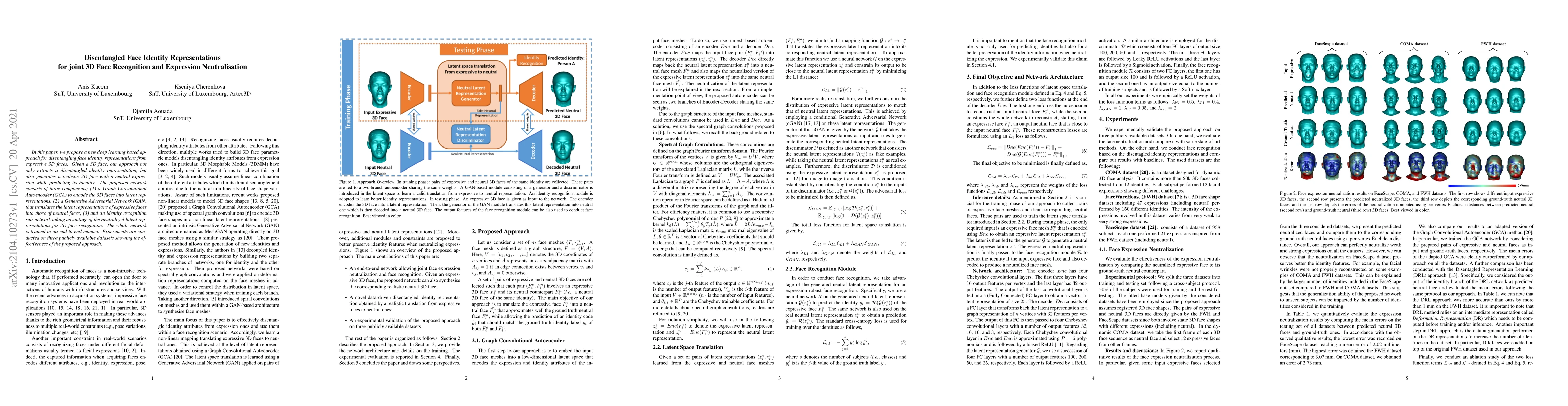 This paper introduces a deep learning method to disentangle identity from expression in 3D faces, generating neutral expressions while predicting identity. The network uses a Graph Convolutional Autoencoder, a Generative Adversarial Network, and an identity recognition sub-network, all trained end-to-end, demonstrating effectiveness on three datasets.