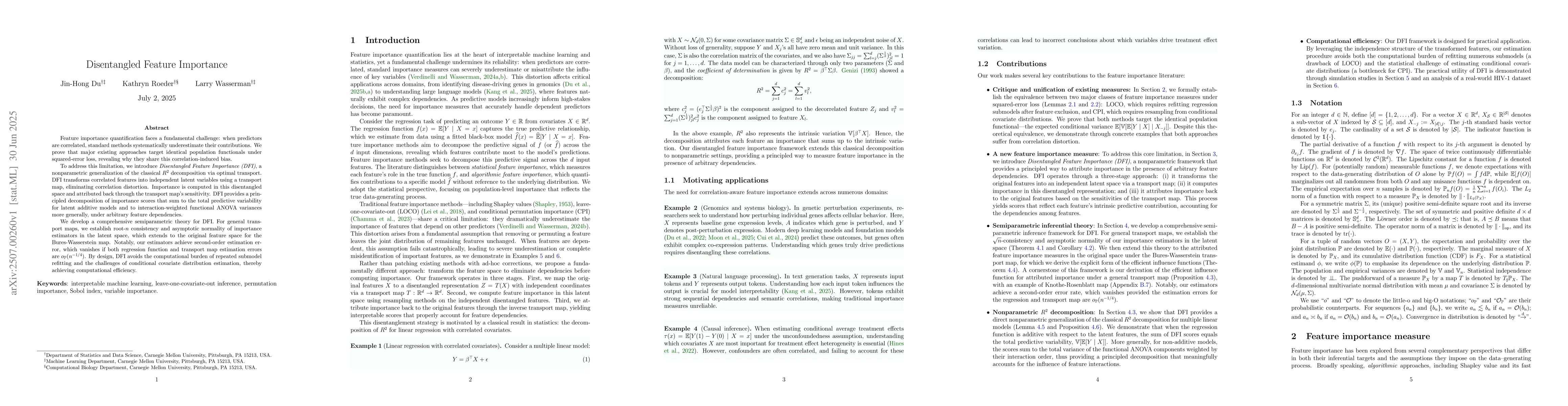 This research introduces Disentangled Feature Importance (DFI), a method that overcomes the limitation of standard feature importance quantification in correlated predictors. DFI transforms correlated features into independent latent variables, ensuring accurate importance attribution. It offers a theoretical foundation with consistency and normality guarantees, and is computationally efficient by avoiding submodel refitting and covariate distribution estimation challenges.