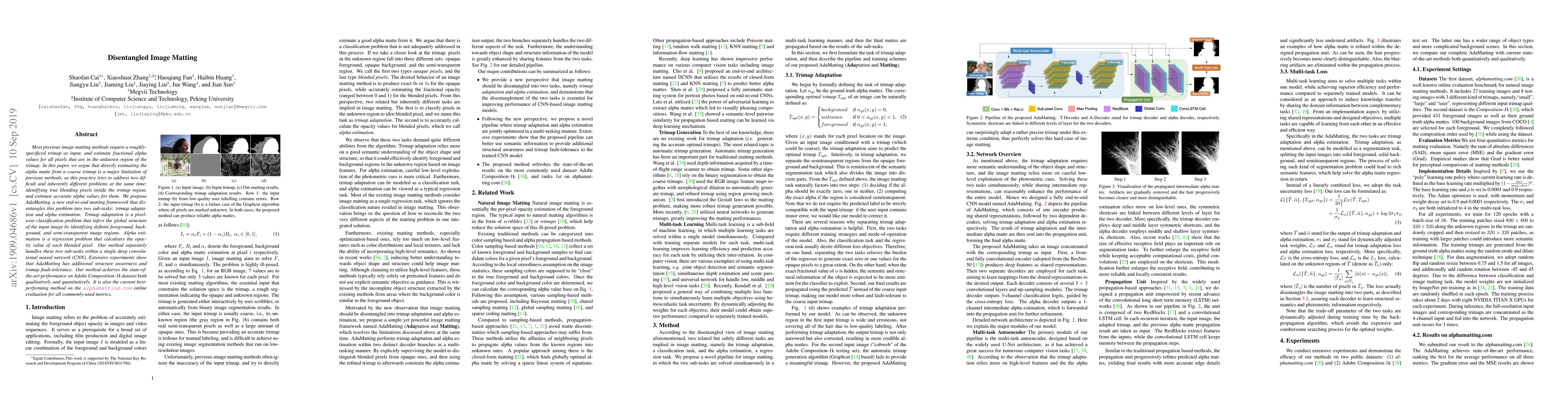 Most previous image matting methods require a roughly-specificed trimap as input, and estimate fractional alpha values for all pixels that are in the unknown region of the trimap. In this paper, we argue that directly estimating the alpha matte from a coarse trimap is a major limitation of previous methods, as this practice tries to address two difficult and inherently different problems at the same time: identifying true blending pixels inside the trimap region, and estimate accurate alpha values for them. We propose AdaMatting, a new end-to-end matting framework that disentangles this problem into two sub-tasks: trimap adaptation and alpha estimation. Trimap adaptation is a pixel-wise classification problem that infers the global structure of the input image by identifying definite foreground, background, and semi-transparent image regions. Alpha estimation is a regression problem that calculates the opacity value of each blended pixel. Our method separately handles these two sub-tasks within a single deep convolutional neural network (CNN). Extensive experiments show that AdaMatting has additional structure awareness and trimap fault-tolerance. Our method achieves the state-of-the-art performance on Adobe Composition-1k dataset both qualitatively and quantitatively. It is also the current best-performing method on the alphamatting.com online evaluation for all commonly-used metrics.
