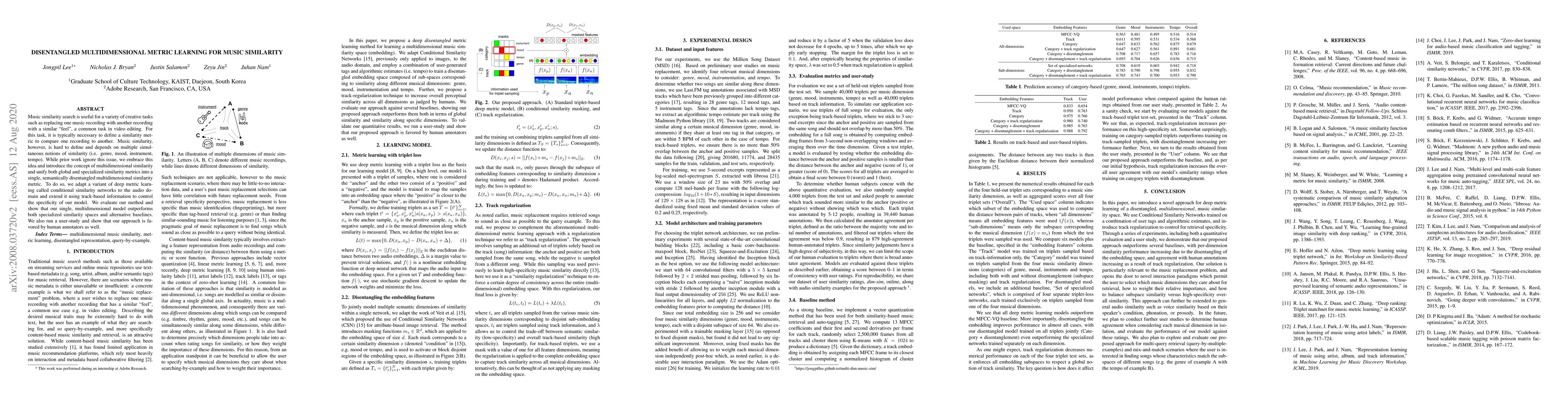 This paper proposes a multidimensional metric learning approach for music similarity search that disentangles various factors like genre, mood, and instrument. The method outperforms specialized models and is preferred by human annotators, as demonstrated through both quantitative evaluation and a user study.