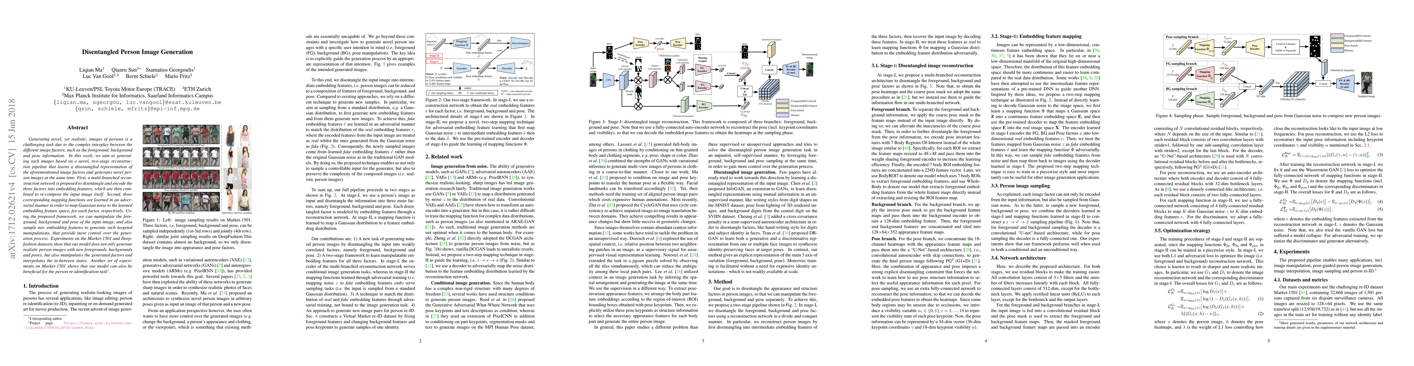 This research proposes a two-stage framework for generating realistic images of persons by disentangling foreground, background, and pose information. The model uses a multi-branched network to encode these factors and adversarial mapping functions to manipulate them, demonstrating effective generation and re-identification benefits on Market-1501 and Deepfashion datasets.