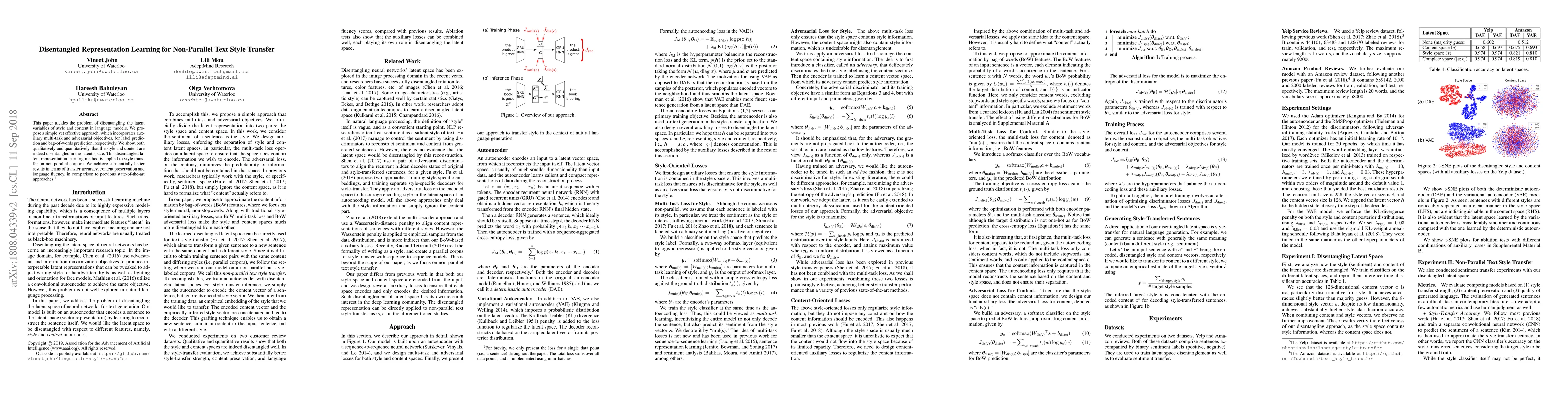 This paper proposes a method that combines multi-task and adversarial objectives to disentangle style and content in language models for non-parallel text style transfer. The approach uses auxiliary losses for label prediction and bag-of-words prediction in both style and content spaces.