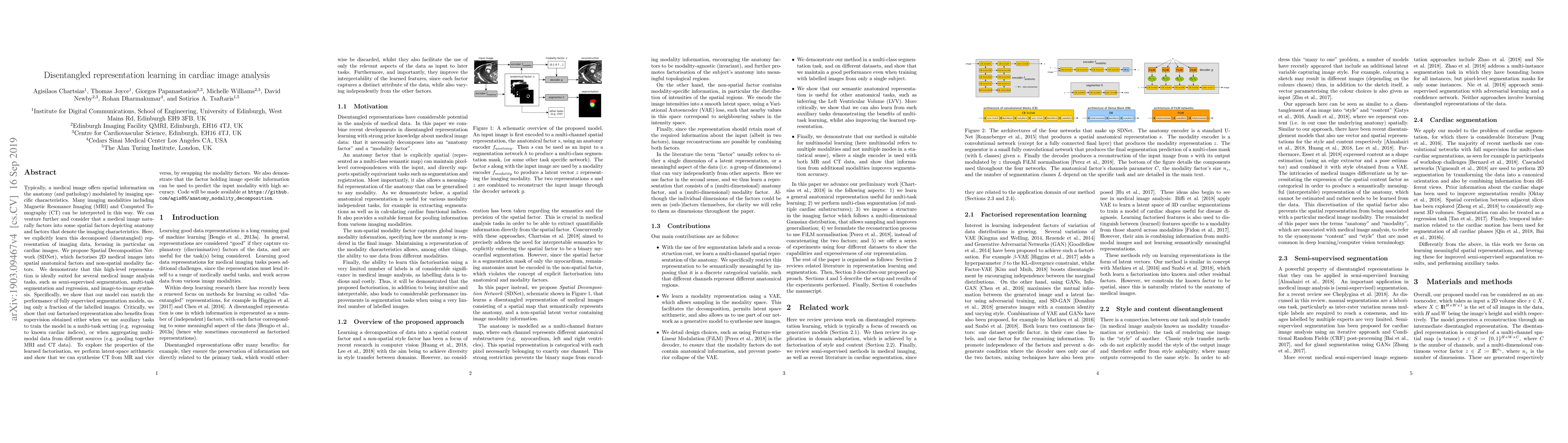 This paper proposes a Spatial Decomposition Network (SDNet) to learn disentangled representations of cardiac images, separating anatomical and imaging modality factors. The model demonstrates competitive performance in tasks like segmentation and synthesis, using fewer labeled images and benefiting from multi-task and multimodal data training.
