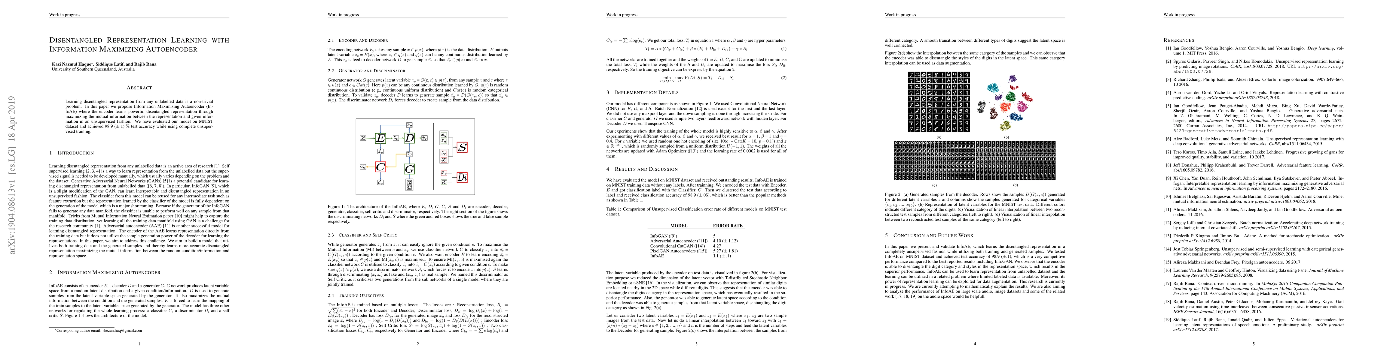 Learning disentangled representation from any unlabelled data is a non-trivial problem. In this paper we propose Information Maximising Autoencoder (InfoAE) where the encoder learns powerful disentangled representation through maximizing the mutual information between the representation and given information in an unsupervised fashion. We have evaluated our model on MNIST dataset and achieved 98.9 ($\pm .1$) $\%$ test accuracy while using complete unsupervised training.