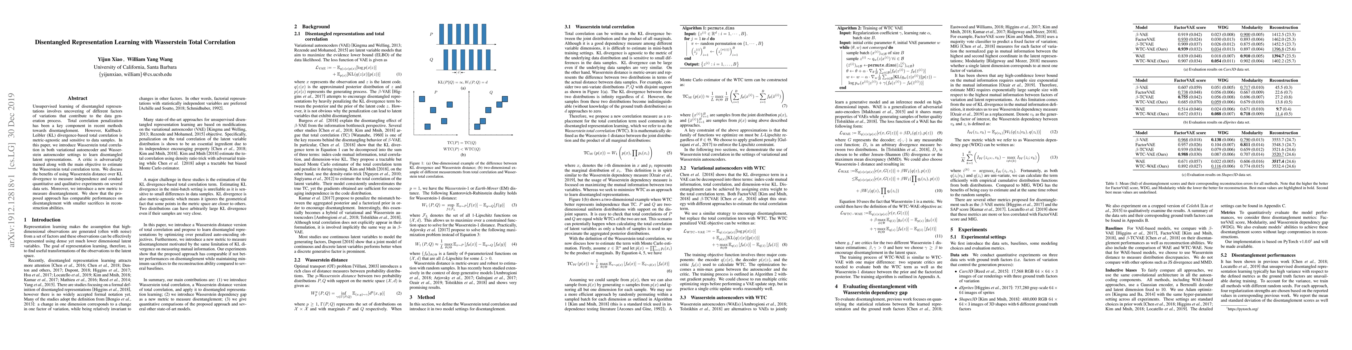 This paper proposes using Wasserstein total correlation in unsupervised learning to obtain disentangled representations, employing both variational and Wasserstein autoencoders. It introduces a critic network to estimate the Wasserstein total correlation and demonstrates that it offers better performance compared to KL divergence-based methods, with comparable disentanglement and improved reconstruction.
