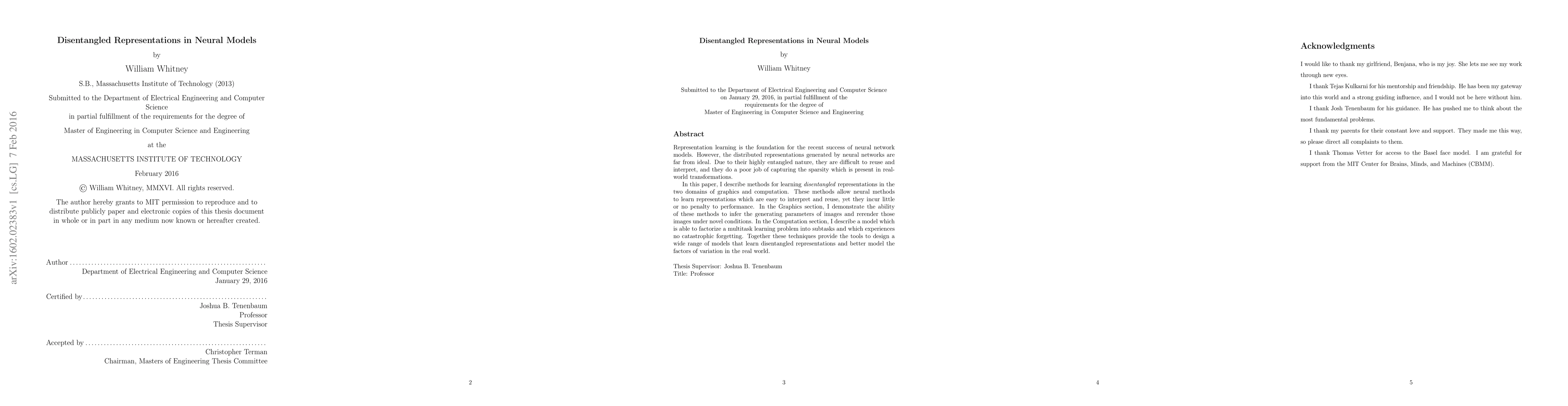 This paper proposes methods for learning disentangled representations in neural networks to improve interpretability and reuse, demonstrating success in graphics by inferring image parameters and in computation by factorizing multitask learning without forgetting.
