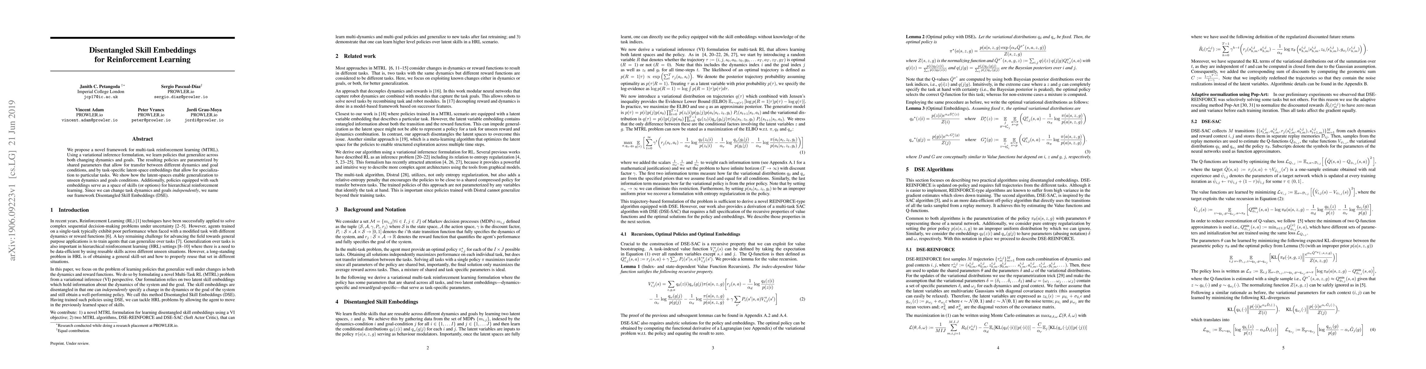 This paper introduces a novel framework for multi-task reinforcement learning called Disentangled Skill Embeddings (DSE), which uses variational inference to learn generalizable policies. The framework employs shared parameters and task-specific latent-space embeddings to enable transfer and specialization, demonstrating generalization to unseen dynamics and goals.