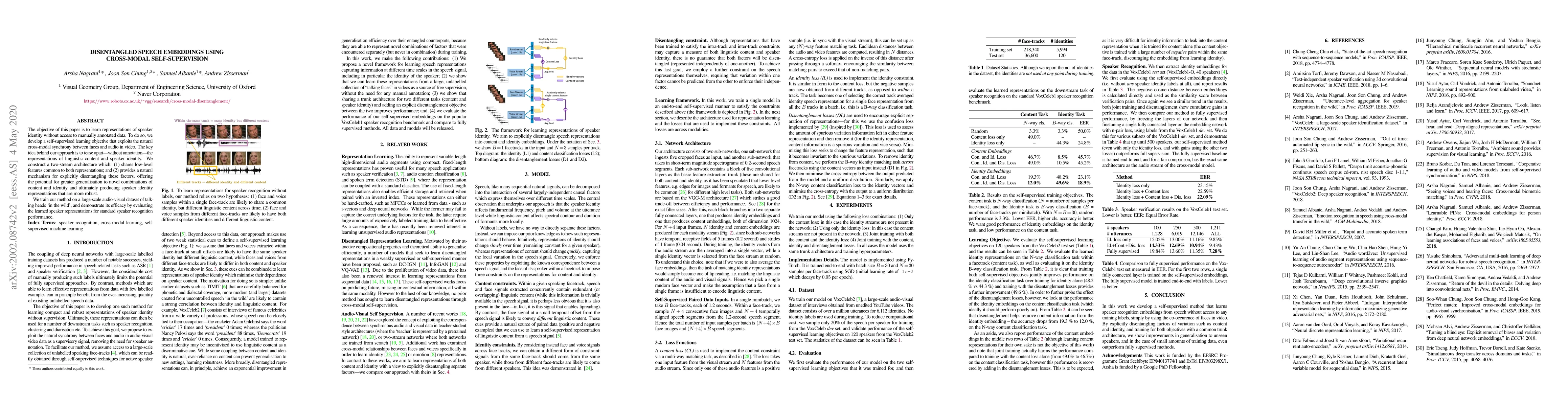 The objective of this paper is to learn representations of speaker identity without access to manually annotated data. To do so, we develop a self-supervised learning objective that exploits the natural cross-modal synchrony between faces and audio in video. The key idea behind our approach is to tease apart--without annotation--the representations of linguistic content and speaker identity. We construct a two-stream architecture which: (1) shares low-level features common to both representations; and (2) provides a natural mechanism for explicitly disentangling these factors, offering the potential for greater generalisation to novel combinations of content and identity and ultimately producing speaker identity representations that are more robust. We train our method on a large-scale audio-visual dataset of talking heads `in the wild', and demonstrate its efficacy by evaluating the learned speaker representations for standard speaker recognition performance.