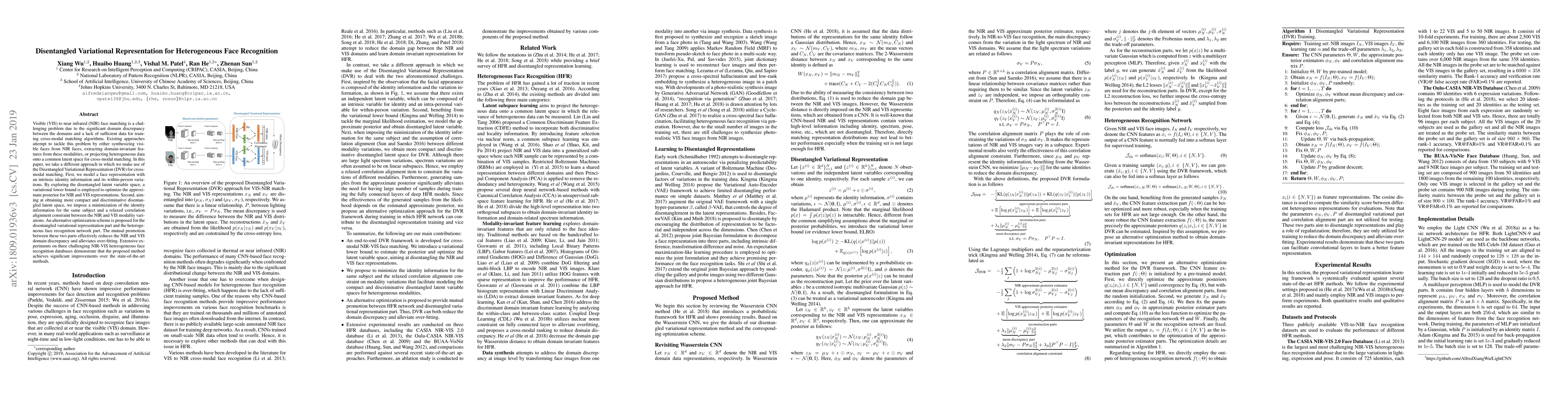 The research proposes Disentangled Variational Representation (DVR) for heterogeneous face recognition, utilizing a disentangled latent variable space and a variational lower bound to optimize approximate posterior for NIR and VIS representations. It imposes constraints to minimize identity information for the same subject and align variations between modalities.