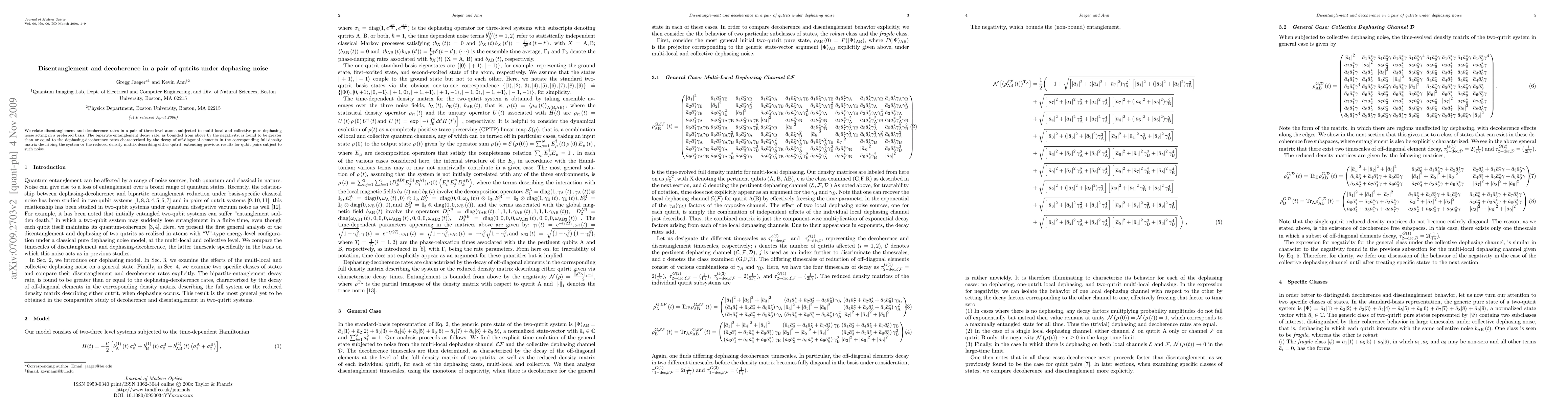 We relate disentanglement and decoherence rates in a pair of three-level atoms subjected to multi-local and collective pure dephasing noise acting in a preferred basis. The bipartite entanglement decay rate, as bounded from above by the negativity, is found to be greater than or equal to the dephasing-decoherence rates characterized by the decay of off-diagonal elements in the corresponding full density matrix describing the system or the reduced density matrix describing either qutrit, extending previous results for qubit pairs subject to such noise.