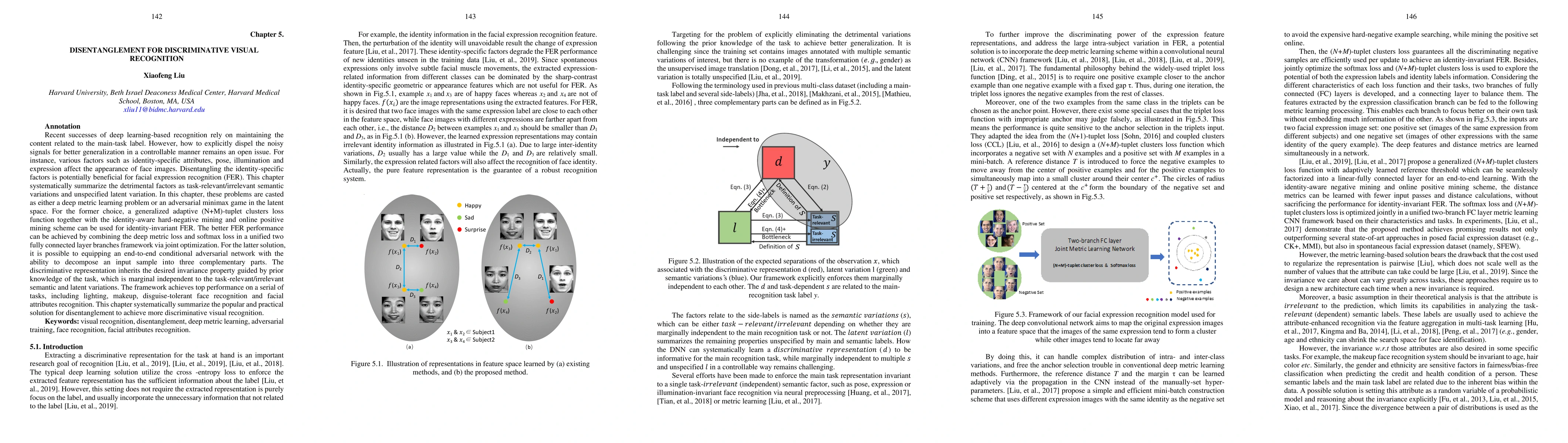 Recent successes of deep learning-based recognition rely on maintaining the content related to the main-task label. However, how to explicitly dispel the noisy signals for better generalization in a controllable manner remains an open issue. For instance, various factors such as identity-specific attributes, pose, illumination and expression affect the appearance of face images. Disentangling the identity-specific factors is potentially beneficial for facial expression recognition (FER). This chapter systematically summarize the detrimental factors as task-relevant/irrelevant semantic variations and unspecified latent variation. In this chapter, these problems are casted as either a deep metric learning problem or an adversarial minimax game in the latent space. For the former choice, a generalized adaptive (N+M)-tuplet clusters loss function together with the identity-aware hard-negative mining and online positive mining scheme can be used for identity-invariant FER. The better FER performance can be achieved by combining the deep metric loss and softmax loss in a unified two fully connected layer branches framework via joint optimization. For the latter solution, it is possible to equipping an end-to-end conditional adversarial network with the ability to decompose an input sample into three complementary parts. The discriminative representation inherits the desired invariance property guided by prior knowledge of the task, which is marginal independent to the task-relevant/irrelevant semantic and latent variations. The framework achieves top performance on a serial of tasks, including lighting, makeup, disguise-tolerant face recognition and facial attributes recognition. This chapter systematically summarize the popular and practical solution for disentanglement to achieve more discriminative visual recognition.