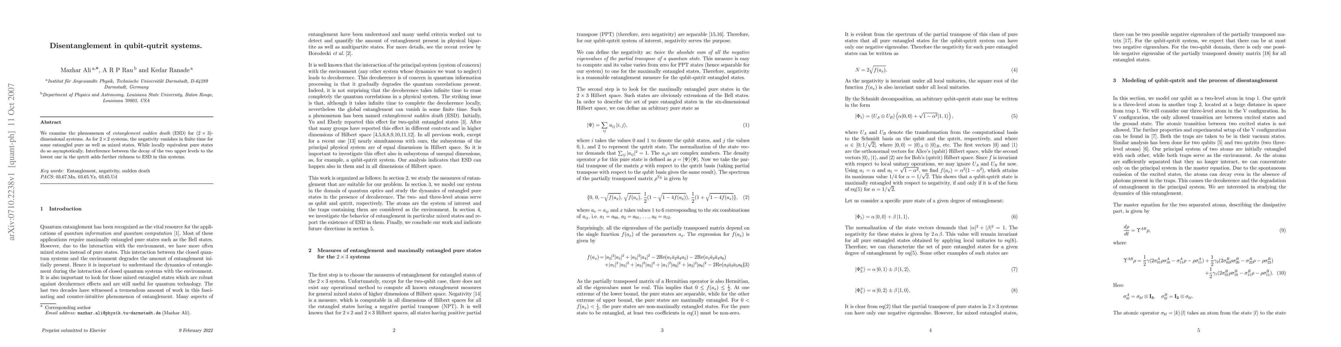We examine the phenomenon of {\it entanglement sudden death} (ESD) for $(2 \times 3)$-dimensional systems. As for $2 \times 2$ systems, the negativity vanishes in finite time for some entangled pure as well as mixed states. While locally equivalent pure states do so asymptotically. Interference between the decay of the two upper levels to the lowest one in the qutrit adds further richness to ESD in this systems.