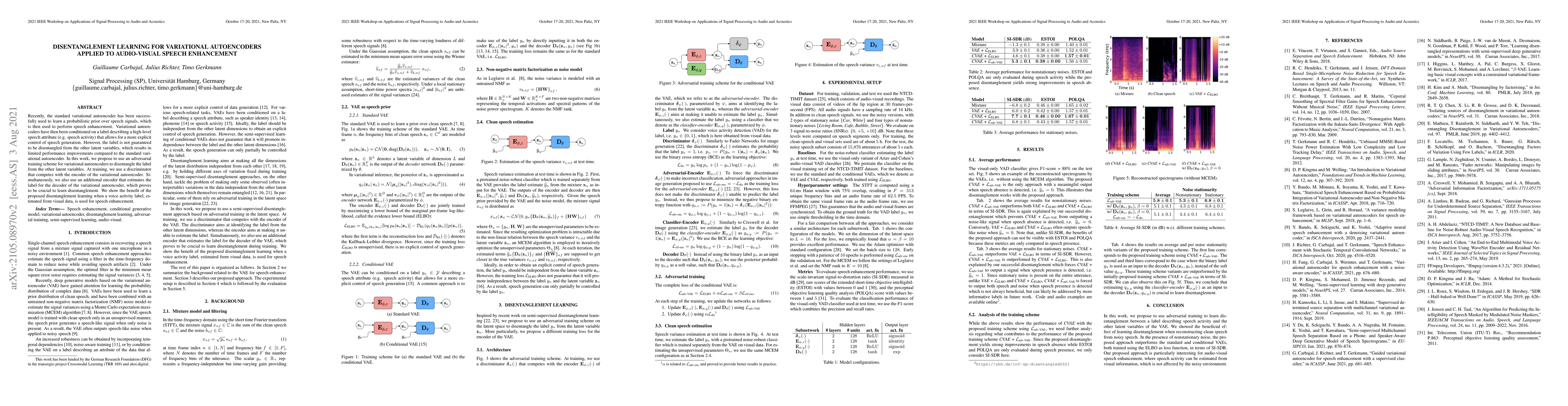 Recently, the standard variational autoencoder has been successfully used to learn a probabilistic prior over speech signals, which is then used to perform speech enhancement. Variational autoencoders have then been conditioned on a label describing a high-level speech attribute (e.g. speech activity) that allows for a more explicit control of speech generation. However, the label is not guaranteed to be disentangled from the other latent variables, which results in limited performance improvements compared to the standard variational autoencoder. In this work, we propose to use an adversarial training scheme for variational autoencoders to disentangle the label from the other latent variables. At training, we use a discriminator that competes with the encoder of the variational autoencoder. Simultaneously, we also use an additional encoder that estimates the label for the decoder of the variational autoencoder, which proves to be crucial to learn disentanglement. We show the benefit of the proposed disentanglement learning when a voice activity label, estimated from visual data, is used for speech enhancement.
