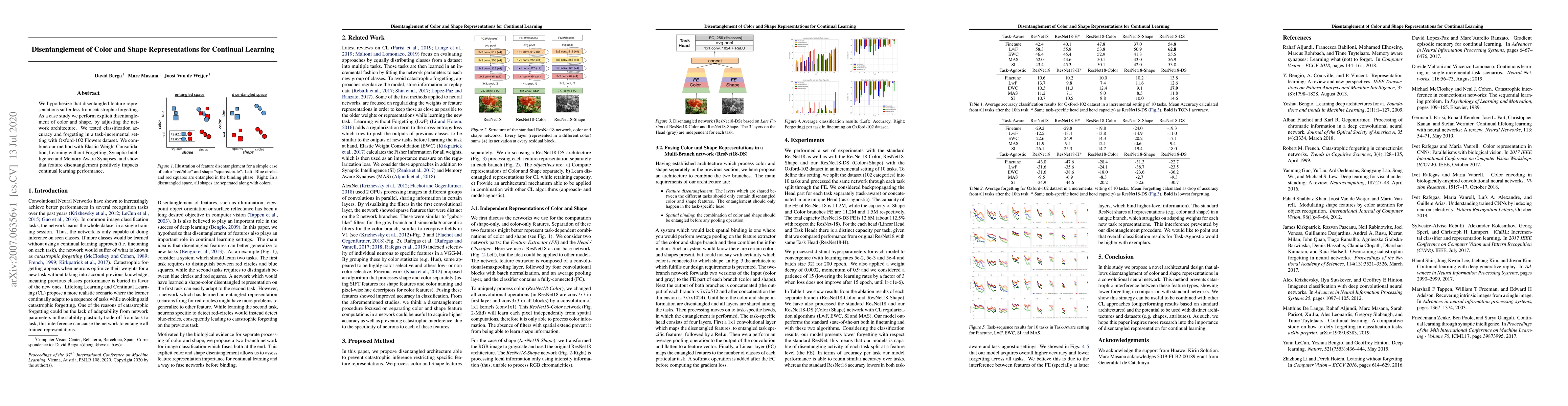 This paper explores how disentangled representations of color and shape can mitigate catastrophic forgetting in continual learning. The study combines feature disentanglement with various learning methods and demonstrates improved performance on the Oxford-102 Flowers dataset.