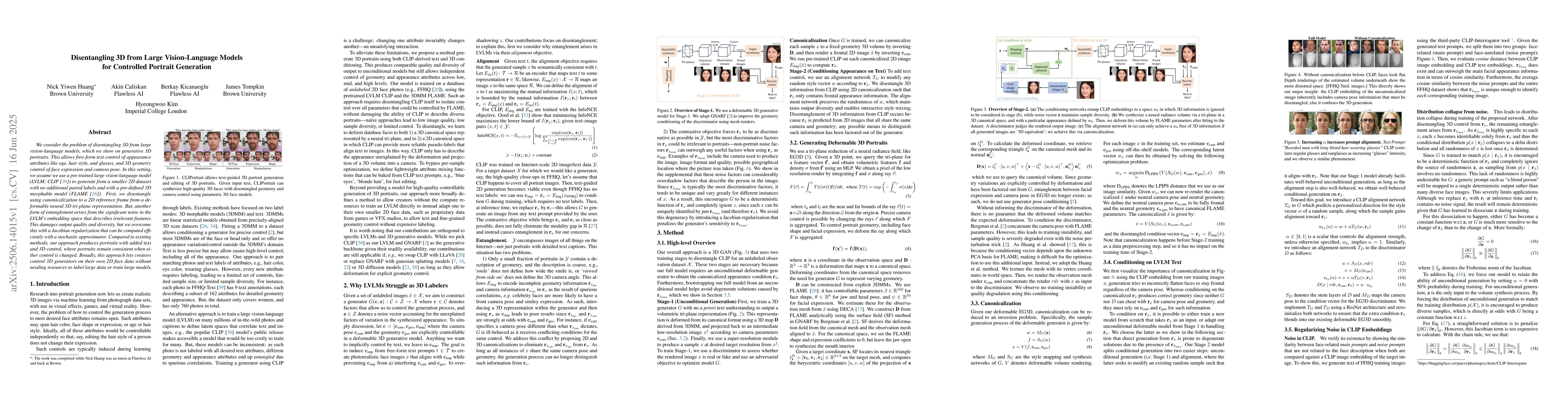We consider the problem of disentangling 3D from large vision-language models, which we show on generative 3D portraits. This allows free-form text control of appearance attributes like age, hair style, and glasses, and 3D geometry control of face expression and camera pose. In this setting, we assume we use a pre-trained large vision-language model (LVLM; CLIP) to generate from a smaller 2D dataset with no additional paired labels and with a pre-defined 3D morphable model (FLAME). First, we disentangle using canonicalization to a 2D reference frame from a deformable neural 3D triplane representation. But another form of entanglement arises from the significant noise in the LVLM's embedding space that describes irrelevant features. This damages output quality and diversity, but we overcome this with a Jacobian regularization that can be computed efficiently with a stochastic approximator. Compared to existing methods, our approach produces portraits with added text and 3D control, where portraits remain consistent when either control is changed. Broadly, this approach lets creators control 3D generators on their own 2D face data without needing resources to label large data or train large models.