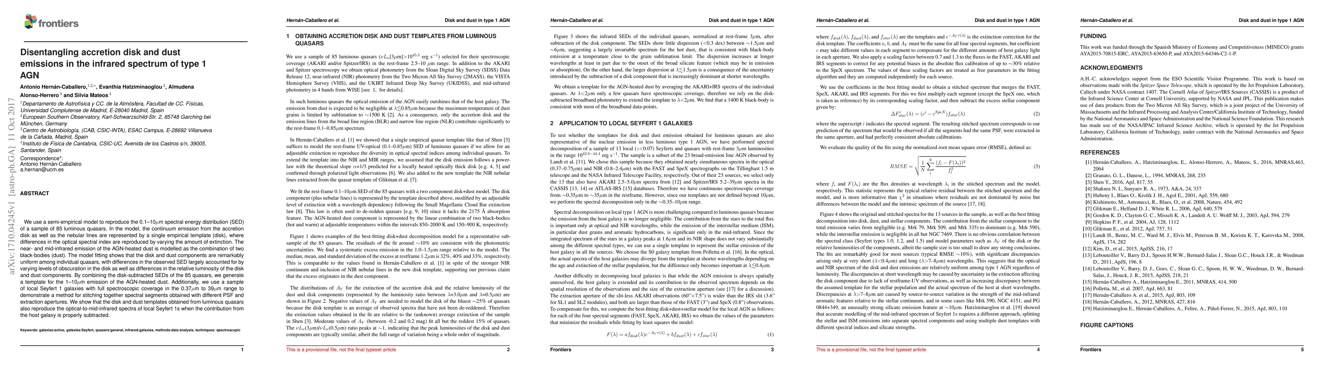 This paper uses a semi-empirical model to disentangle the accretion disk and dust emissions in the infrared spectrum of type 1 AGNs, finding uniformity in disk and dust components across quasars. The model also successfully reproduces the optical-to-mid-infrared spectra of local Seyfert 1 galaxies after subtracting host galaxy contributions.