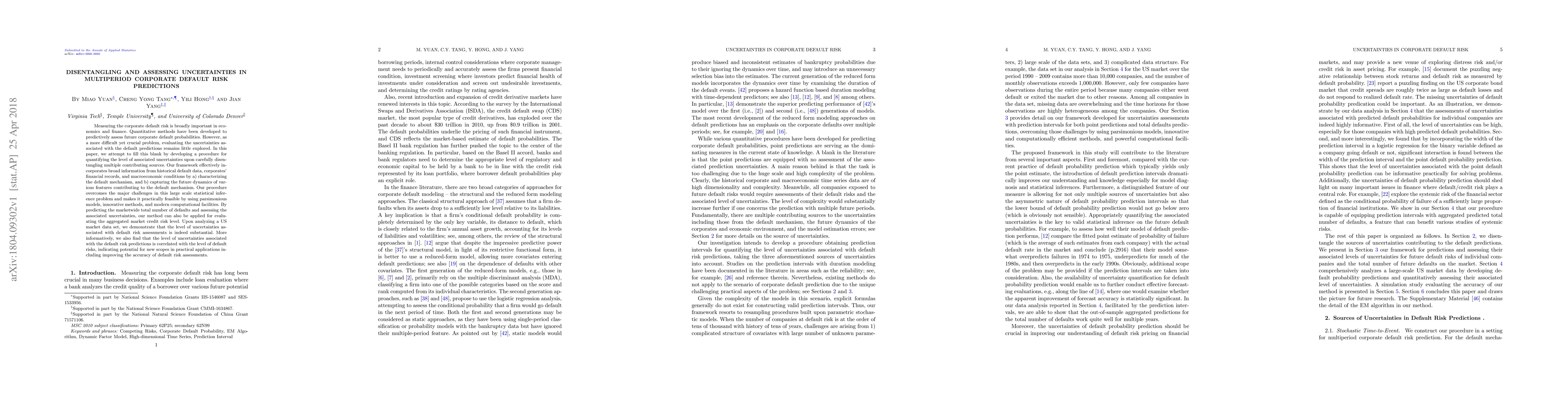 Measuring the corporate default risk is broadly important in economics and finance. Quantitative methods have been developed to predictively assess future corporate default probabilities. However, as a more difficult yet crucial problem, evaluating the uncertainties associated with the default predictions remains little explored. In this paper, we attempt to fill this blank by developing a procedure for quantifying the level of associated uncertainties upon carefully disentangling multiple contributing sources. Our framework effectively incorporates broad information from historical default data, corporates' financial records, and macroeconomic conditions by a) characterizing the default mechanism, and b) capturing the future dynamics of various features contributing to the default mechanism. Our procedure overcomes the major challenges in this large scale statistical inference problem and makes it practically feasible by using parsimonious models, innovative methods, and modern computational facilities. By predicting the marketwide total number of defaults and assessing the associated uncertainties, our method can also be applied for evaluating the aggregated market credit risk level. Upon analyzing a US market data set, we demonstrate that the level of uncertainties associated with default risk assessments is indeed substantial. More informatively, we also find that the level of uncertainties associated with the default risk predictions is correlated with the level of default risks, indicating potential for new scopes in practical applications including improving the accuracy of default risk assessments.