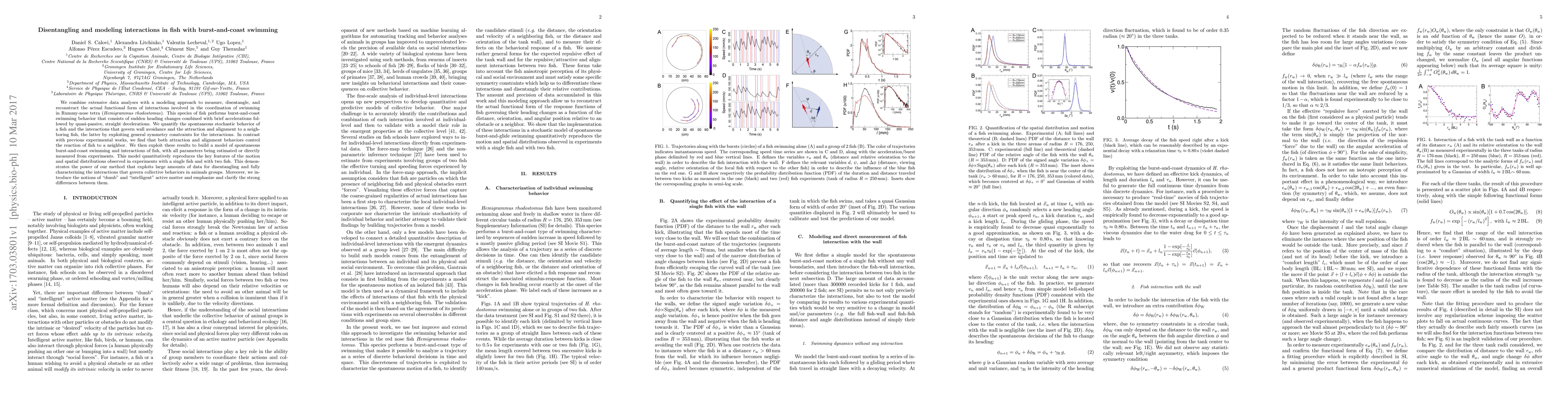 We combine extensive data analyses with a modeling approach to measure, disentangle, and reconstruct the actual functional form of interactions involved in the coordination of swimming in Rummy-nose tetra (Hemigrammus rhodostomus). This species of fish performs burst-and-coast swimming behavior that consists of sudden heading changes combined with brief accelerations followed by quasi-passive, straight decelerations. We quantify the spontaneous stochastic behavior of a fish and the interactions that govern wall avoidance and the attraction and alignment to a neighboring fish, the latter by exploiting general symmetry constraints for the interactions. In contrast with previous experimental works, we find that both attraction and alignment behaviors control the reaction of fish to a neighbor. We then exploit these results to build a model of spontaneous burst-and-coast swimming and interactions of fish, with all parameters being estimated or directly measured from experiments. This model quantitatively reproduces the key features of the motion and spatial distributions observed in experiments with a single fish and with two fish. This demonstrates the power of our method that exploits large amounts of data for disentangling and fully characterizing the interactions that govern collective behaviors in animals groups. Moreover, we introduce the notions of "dumb" and "intelligent" active matter and emphasize and clarify the strong differences between them.