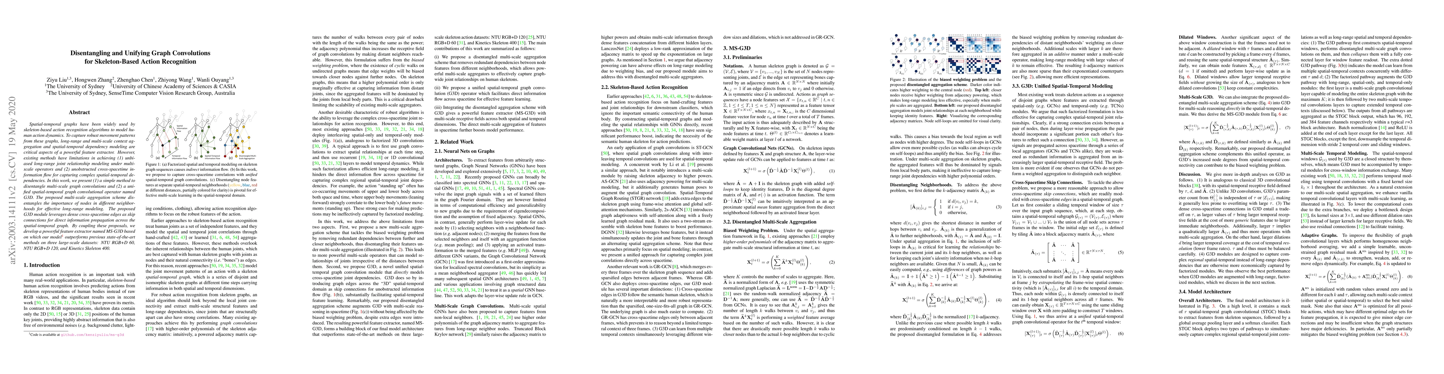 Spatial-temporal graphs have been widely used by skeleton-based action recognition algorithms to model human action dynamics. To capture robust movement patterns from these graphs, long-range and multi-scale context aggregation and spatial-temporal dependency modeling are critical aspects of a powerful feature extractor. However, existing methods have limitations in achieving (1) unbiased long-range joint relationship modeling under multi-scale operators and (2) unobstructed cross-spacetime information flow for capturing complex spatial-temporal dependencies. In this work, we present (1) a simple method to disentangle multi-scale graph convolutions and (2) a unified spatial-temporal graph convolutional operator named G3D. The proposed multi-scale aggregation scheme disentangles the importance of nodes in different neighborhoods for effective long-range modeling. The proposed G3D module leverages dense cross-spacetime edges as skip connections for direct information propagation across the spatial-temporal graph. By coupling these proposals, we develop a powerful feature extractor named MS-G3D based on which our model outperforms previous state-of-the-art methods on three large-scale datasets: NTU RGB+D 60, NTU RGB+D 120, and Kinetics Skeleton 400.